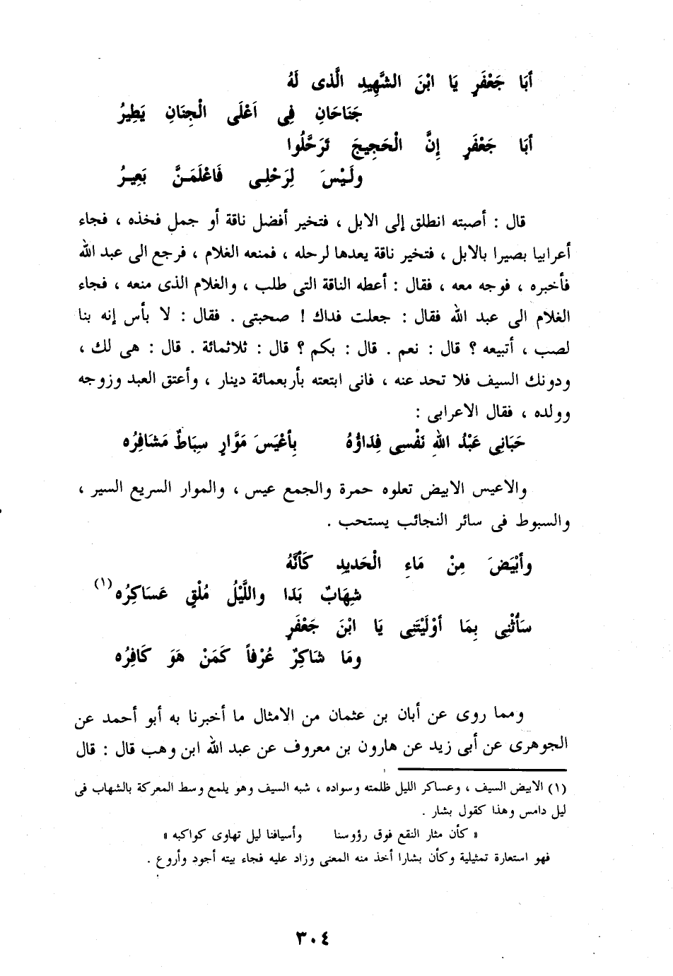 قال: أصبته انطلق إلى الابل، فتخير أفضل ناقة أو جمل فخذه، فجاء أعرابيا بصيرا بالابل، فتخير ناقة يعدها لرحله، فمنعه الغلام، فرجع الى عبد الله فأخبره، فوجه معه، فقال: أعطه الناقة التى طلب، والغلام الذى منعه، فجاء الغلام الى عبد الله فقال: جعلت فداك! صحبتى. فقال: لا بأس إنه بنا لصب، أتبيعه؟ قال: نعم. قال: بكم؟ قال: ثلاثمائة. قال: هى لك، ودونك السيف فلا تحد عنه، فانى ابتعته بأربعمائة دينار، وأعتق العبد وزوجه وولده، فقال الاعرابى: