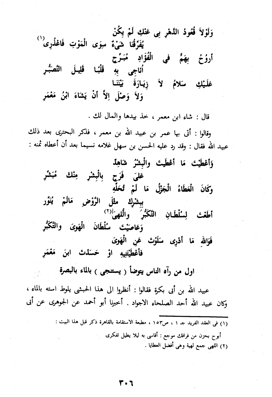 وقالوا: أتى بها عمر بن عبيد الله بن معمر، فذكر البحترى بعد ذلك عبيد الله فقال: وقد رد عليه الحسن بن سهل غلامه نسيما بعد أن أعطاه ثمنه: