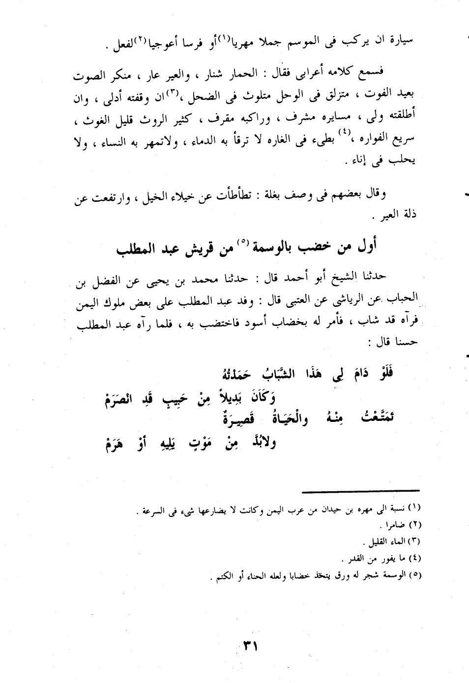 فسمع كلامه أعرابى فقال: الحمار شنار، والعير عار، منكر الصوت بعيد الفوت، متزلق فى الوحل متلوث فى الضحل، «3» ان وقفته أدلى، وان أطلقته ولى، مسايره مشرف، وراكبه مقرف، كثير الروث قليل الغوث، سريع الفواره، «4» بطىء فى الغاره لا ترقأ به الدماء، ولا تمهر به النساء، ولا يحلب فى إناء.