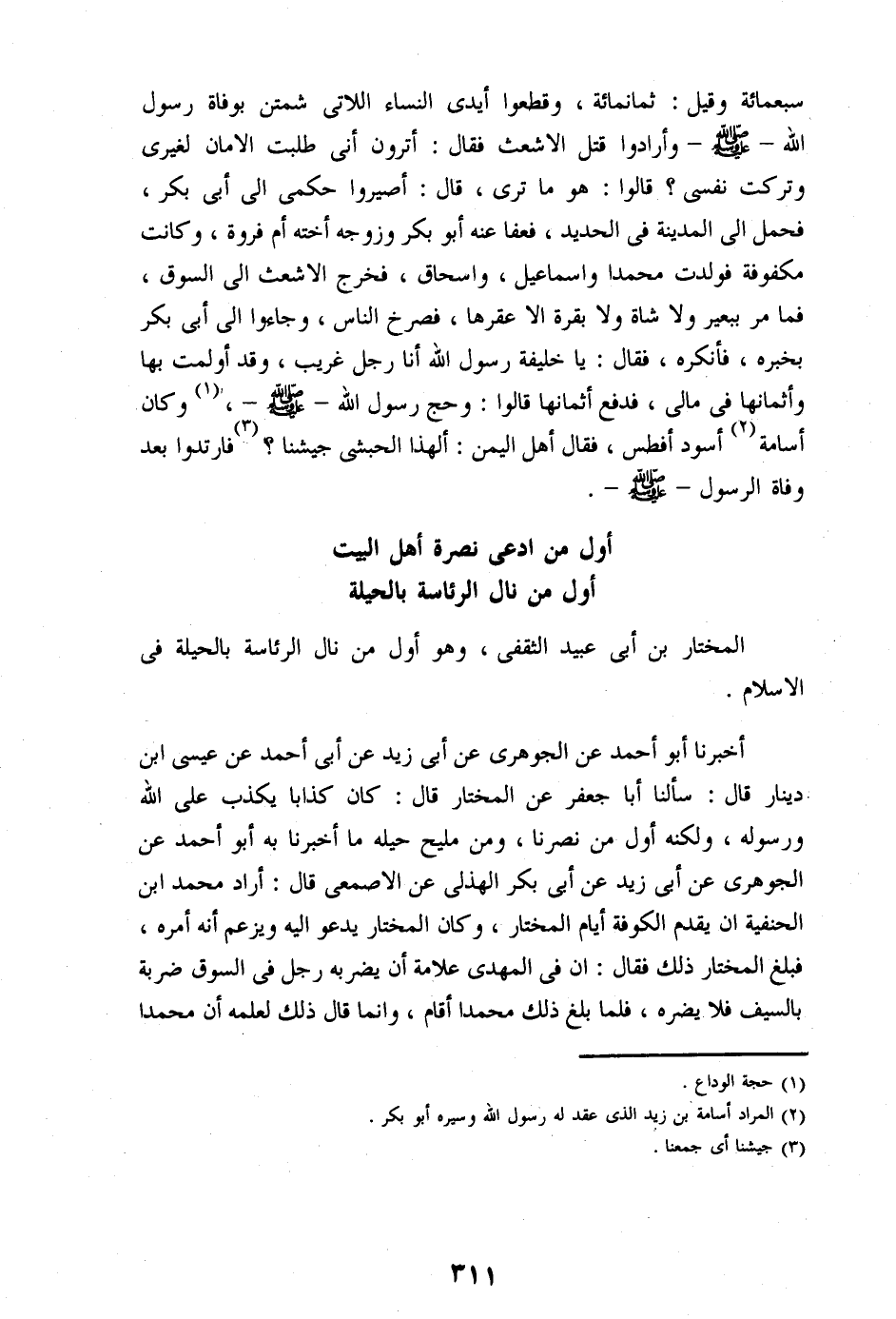 سبعمائة وقيل: ثمانمائة، وقطعوا أيدى النساء اللاتى شمتن بوفاة رسول الله- صلّى الله عليه وسلم- وأرادوا قتل الاشعث فقال: أترون أنى طلبت الامان لغيرى وتركت نفسى؟ قالوا: هو ما ترى، قال: أصيروا حكمى الى أبى بكر، فحمل الى المدينة فى الحديد، فعفا عنه أبو بكر وزوجه أخته أم فروة، وكانت مكفوفة فولدت محمدا واسماعيل، واسحاق، فخرج الاشعث الى السوق، فما مر ببعير ولا شاة ولا بقرة الا عقرها، فصرخ الناس، وجاءوا الى أبى بكر بخبره، فأنكره، فقال: يا خليفة رسول الله أنا رجل غريب، وقد أولمت بها وأثمانها فى مالى، فدفع أثمانها قالوا: وحج رسول الله- صلّى الله عليه وسلم-، «1» وكان أسامة «2» أسود أفطس، فقال أهل اليمن: ألهذا الحبشى جيشنا؟ «3» فارتدوا بعد وفاة الرسول- صلّى الله عليه وسلم-.