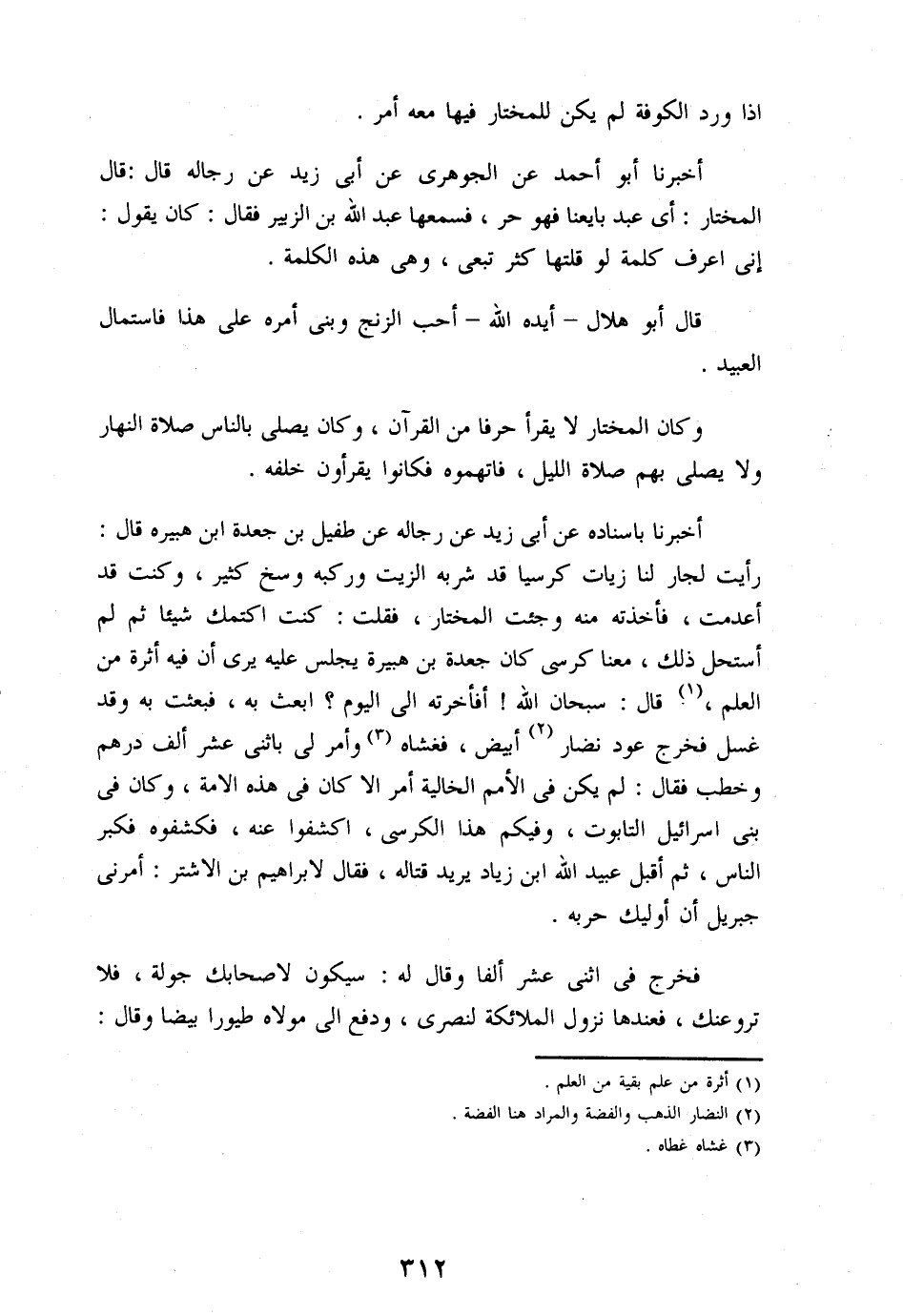 رأيت لجار لنا زيات كرسيا قد شربه الزيت وركبه وسخ كثير، وكنت قد أعدمت، فأخذته منه وجئت المختار، فقلت: كنت اكتمك شيئا ثم لم أستحل ذلك، معنا كرسى كان جعدة بن هبيرة يجلس عليه يرى أن فيه أثرة من العلم، «1» قال: سبحان الله! أفأخرته الى اليوم؟ ابعث به، فبعثت به وقد غسل فخرج عود نضار «2» أبيض، فغشاه «3» وأمر لى باثنى عشر ألف درهم وخطب فقال: لم يكن فى الأمم الخالية أمر الا كان فى هذه الامة، وكان فى بنى اسرائيل التابوت، وفيكم هذا الكرسى، اكشفوا عنه، فكشفوه فكبر الناس، ثم أقبل عبيد الله ابن زياد يريد قتاله، فقال لابراهيم بن الاشتر: أمرنى جبريل أن أوليك حربه.