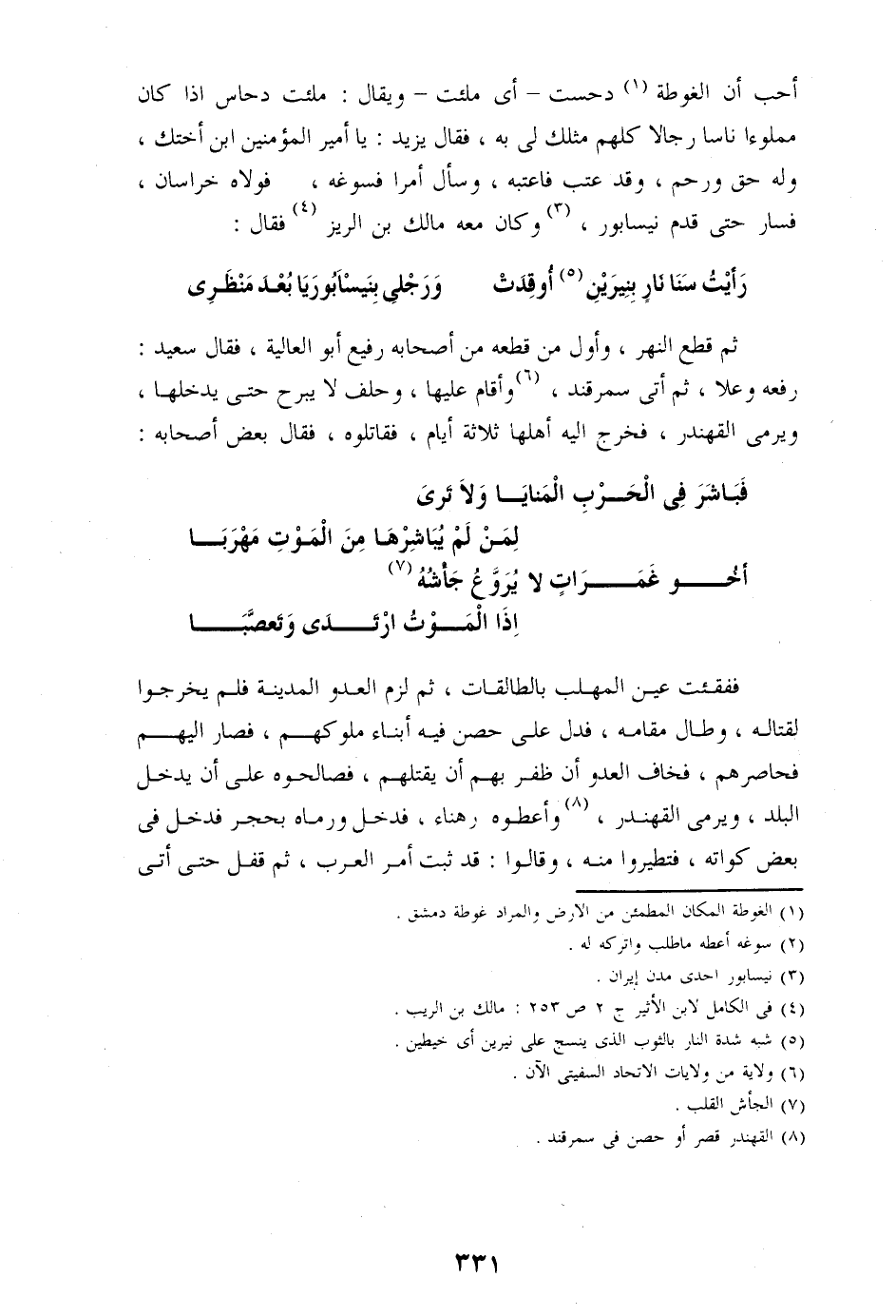 أحب أن الغوطة «1» دحست- أى ملئت- ويقال: ملئت دحاس اذا كان مملوءا ناسا رجالا كلهم مثلك لى به، فقال يزيد: يا أمير المؤمنين ابن أختك، وله حق ورحم، وقد عتب فاعتبه، وسأل أمرا فسوغه «2» ، فولاه خراسان، فسار حتى قدم نيسابور، «3» وكان معه مالك بن الريز «4» فقال: