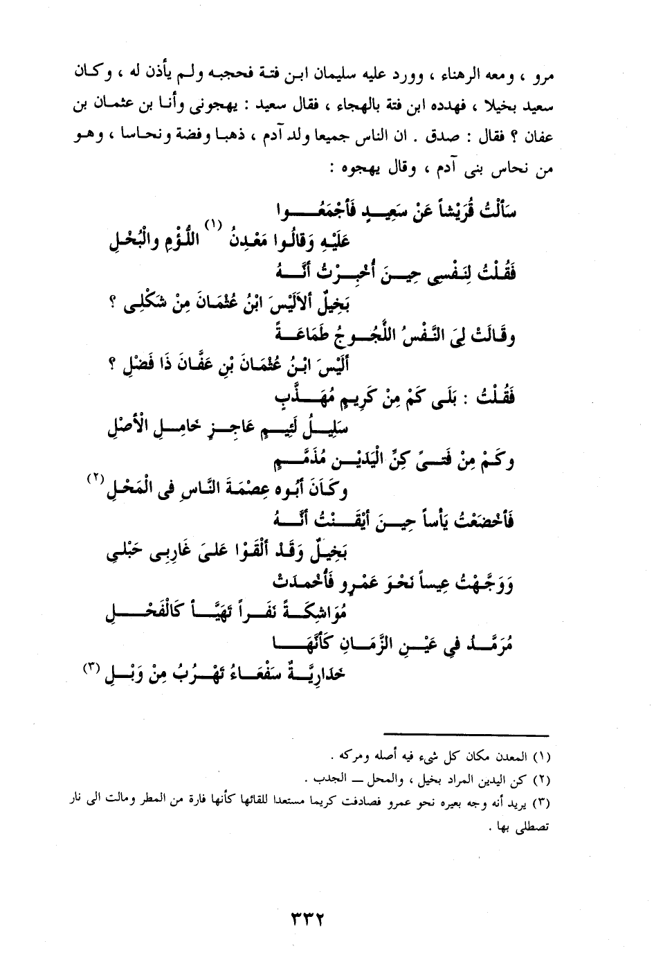 سألت قريشا عن سعيد فأجمعوا ... عليه وقالوا معدن «1» اللّؤم والبخل