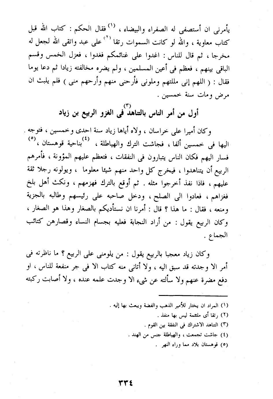 وكان أميرا على خراسان، ولاه أياها زياد سنة احدى وخمسين، فتوجه اليها فى خمسين ألفا، فجاشت الترك والهياطلة، «4» بناحية قوهستان، «5» فسار اليهم فكان الناس يتبارون فى النفقات، فتعظم عليهم المؤونة، فأمرهم الربيع أن يتناهدوا، فيخرج كل واحد منهم شيئا معلوما، ويولونه رجلا ثقة عليهم، فاذا نفذ أخرجوا مثله. ثم أوقع بالترك فهزمهم، ونكث أهل بلخ فغزاهم، فعادوا الى الصلح، ودخل صاحبه على رئيسهم وطالبه بالجزية ومنعه، فقال: ما هذا؟ قال: أمرنا ان نستأديكم بالصغار وهذا هو الصغار، وكان الربيع يقول: من أراد النجابة فعليه بجسام النساء وقصارهن كتائب الجماع.