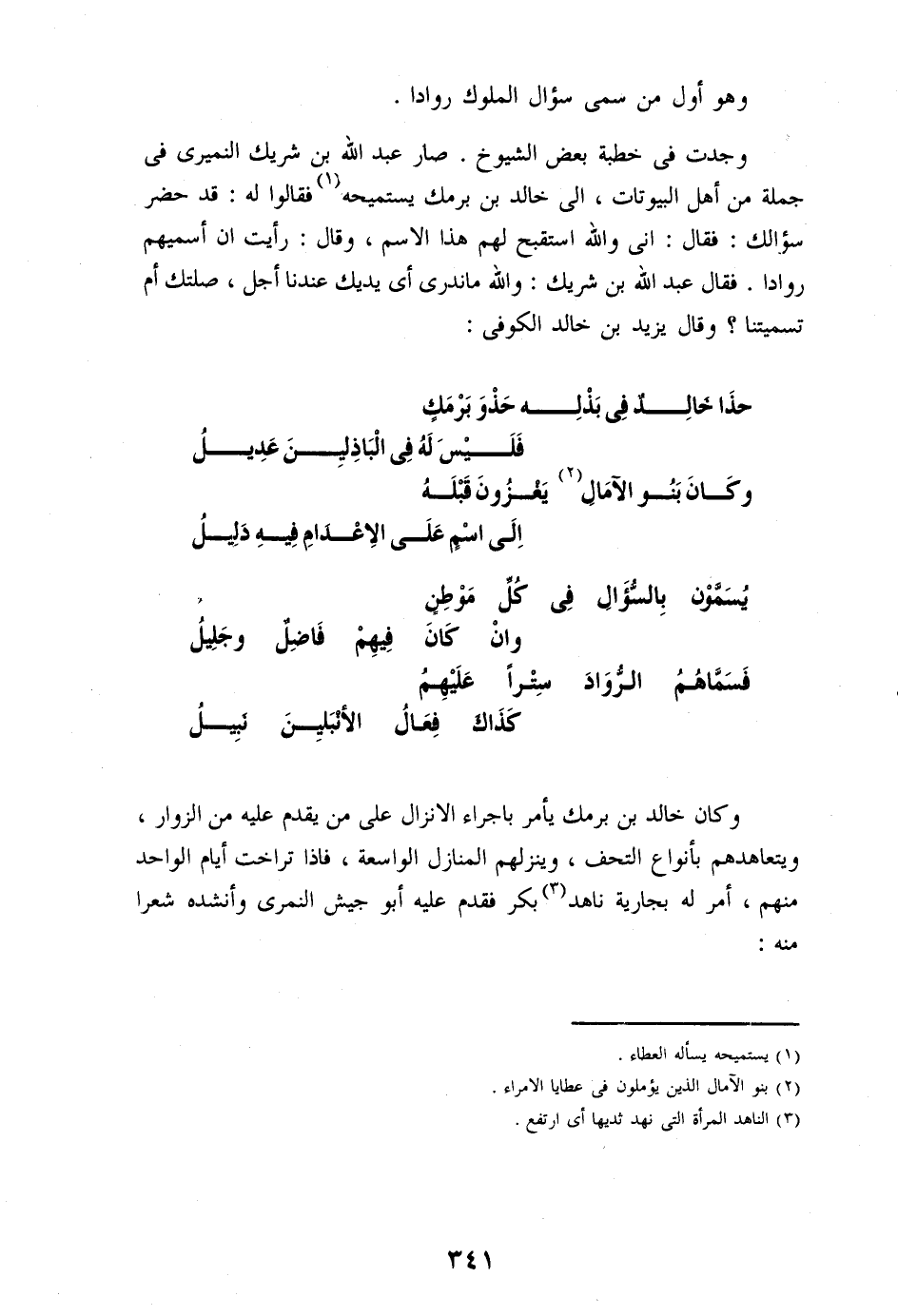 وكان خالد بن برمك يأمر باجراء الانزال على من يقدم عليه من الزوار، ويتعاهدهم بأنواع التحف، وينزلهم المنازل الواسعة، فاذا تراخت أيام الواحد منهم، أمر له بجارية ناهد «3» بكر فقدم عليه أبو جيش النمرى وأنشده شعرا منه: