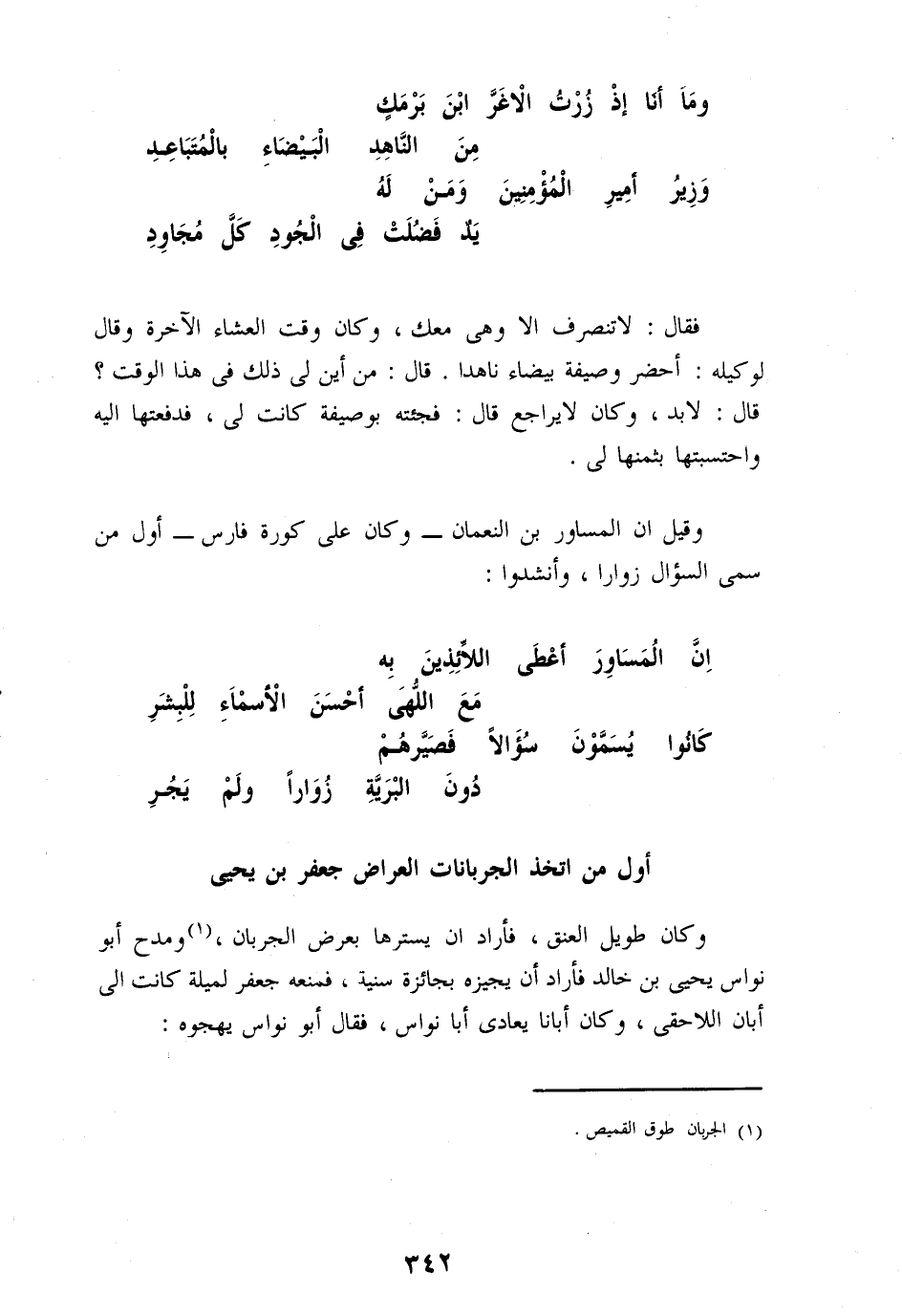 وكان طويل العنق، فأراد ان يسترها بعرض الجربان، «1» ومدح أبو نواس يحيى بن خالد فأراد أن يجيزه بجائزة سنية، فمنعه جعفر لميلة كانت الى أبان اللاحقى، وكان أبانا يعادى أبا نواس، فقال أبو نواس يهجوه: