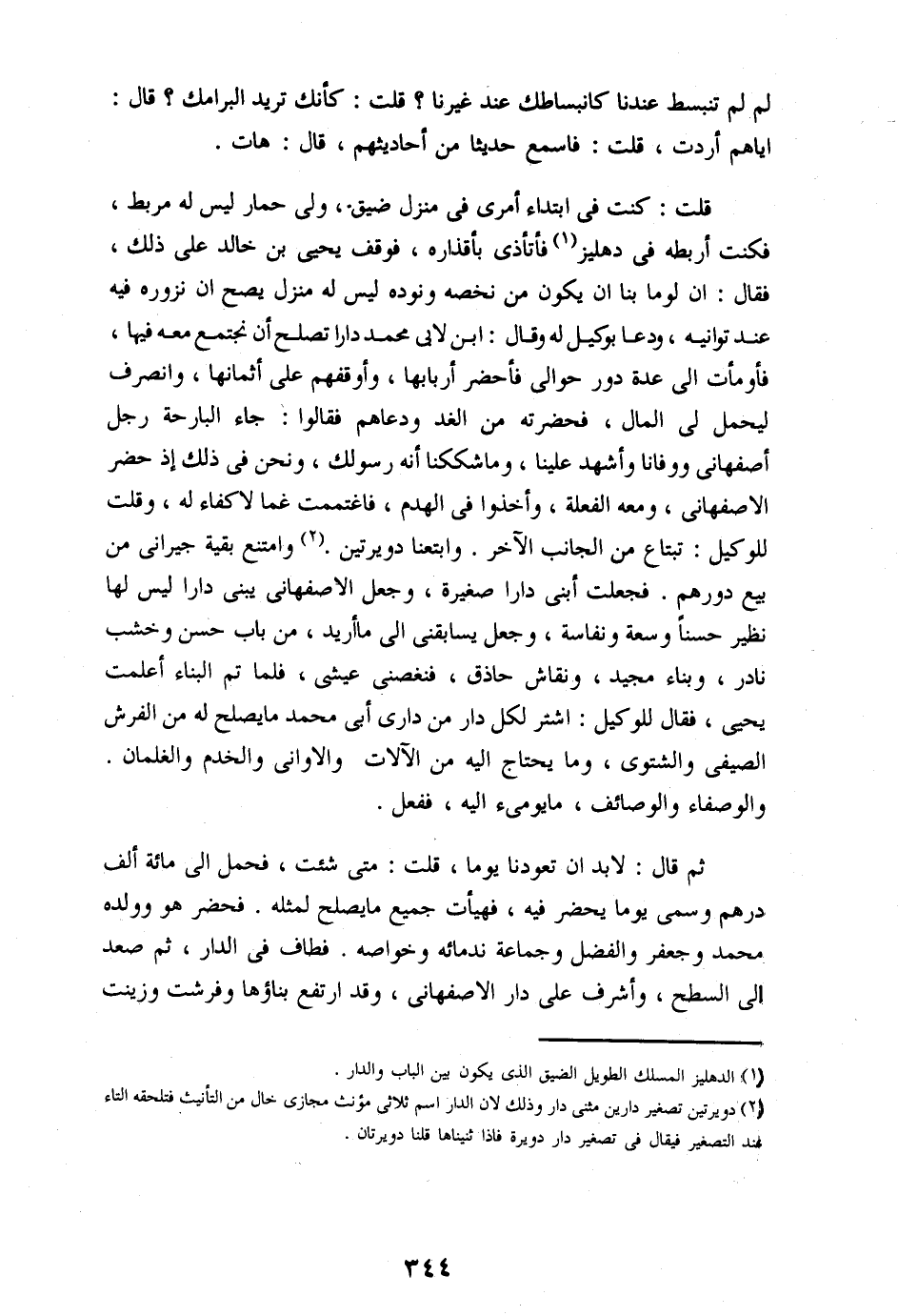 قلت: كنت فى ابتداء أمرى فى منزل ضيق، ولى حمار ليس له مربط، فكنت أربطه فى دهليز «1» فأتأذى بأقذاره، فوقف يحيى بن خالد على ذلك، فقال: ان لوما بنا ان يكون من نخصه ونوده ليس له منزل يصح ان نزوره فيه عند توانيه، ودعا بوكيل له وقال: ابن لابى محمد دارا تصلح أن نجتمع معه فيها، فأومأت الى عدة دور حوالى فأحضر أربابها، وأوقفهم على أثمانها، وانصرف ليحمل لى المال، فحضرته من الغد ودعاهم فقالوا: جاء البارحة رجل أصفهانى ووفانا وأشهد علينا، وما شككنا أنه رسولك، ونحن فى ذلك إذ حضر الاصفهانى، ومعه الفعلة، وأخذوا فى الهدم، فاغتممت غما لاكفاء له، وقلت للوكيل: تبتاع من الجانب الآخر. وابتعنا دويرتين. «2» وامتنع بقية جيرانى من بيع دورهم. فجعلت أبنى دارا صغيرة، وجعل الاصفهانى يبنى دارا ليس لها نظير حسنا وسعة ونفاسة، وجعل يسابقنى الى ما أريد، من باب حسن وخشب نادر، وبناء مجيد، ونقاش حاذق، فنغصنى عيشى، فلما تم البناء أعلمت يحيى، فقال للوكيل: اشتر لكل دار من دارى أبى محمد ما يصلح له من الفرش الصيفى والشتوى، وما يحتاج اليه من الآلات والاوانى والخدم والغلمان.