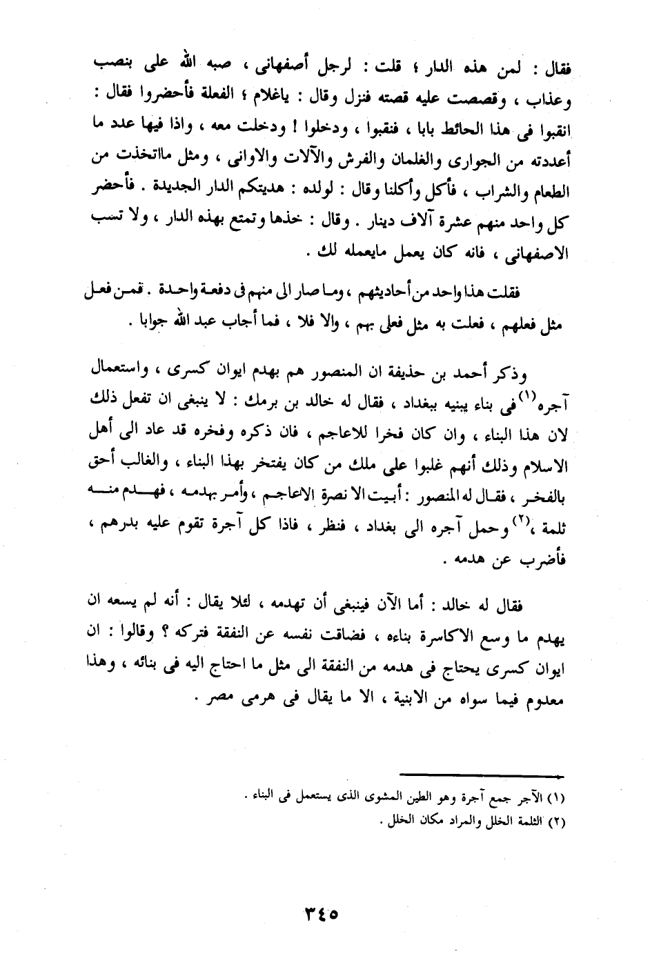 وذكر أحمد بن حذيفة ان المنصور هم بهدم ايوان كسرى، واستعمال آجره «1» فى بناء يبنيه ببغداد، فقال له خالد بن برمك: لا ينبغى ان تفعل ذلك لان هذا البناء، وان كان فخرا للاعاجم، فان ذكره وفخره قد عاد الى أهل الاسلام وذلك أنهم غلبوا على ملك من كان يفتخر بهذا البناء، والغالب أحق بالفخر، فقال له المنصور: أبيت الانصرة الاعاجم، وأمر بهدمه، فهدم منه ثلمة، «2» وحمل آجره الى بغداد، فنظر، فاذا كل آجرة تقوم عليه بدرهم، فأضرب عن هدمه.