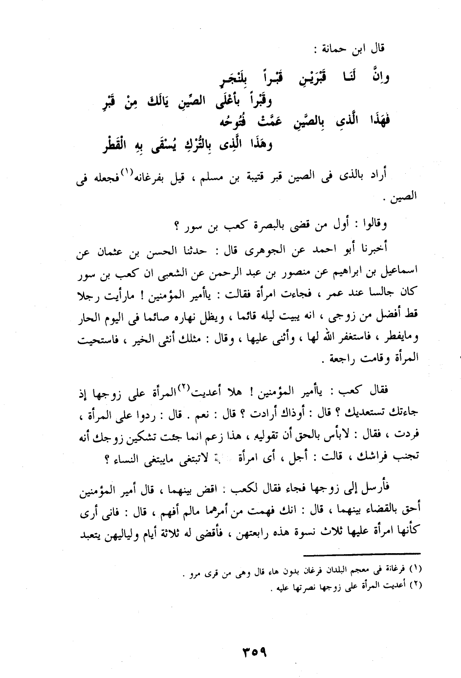 فأرسل إلى زوجها فجاء فقال لكعب: اقض بينهما، قال أمير المؤمنين أحق بالقضاء بينهما، قال: انك فهمت من أمرهما ما لم أفهم، قال: فانى أرى كأنها امرأة عليها ثلاث نسوة هذه رابعتهن، فأقضى له ثلاثة أيام ولياليهن يتعبد