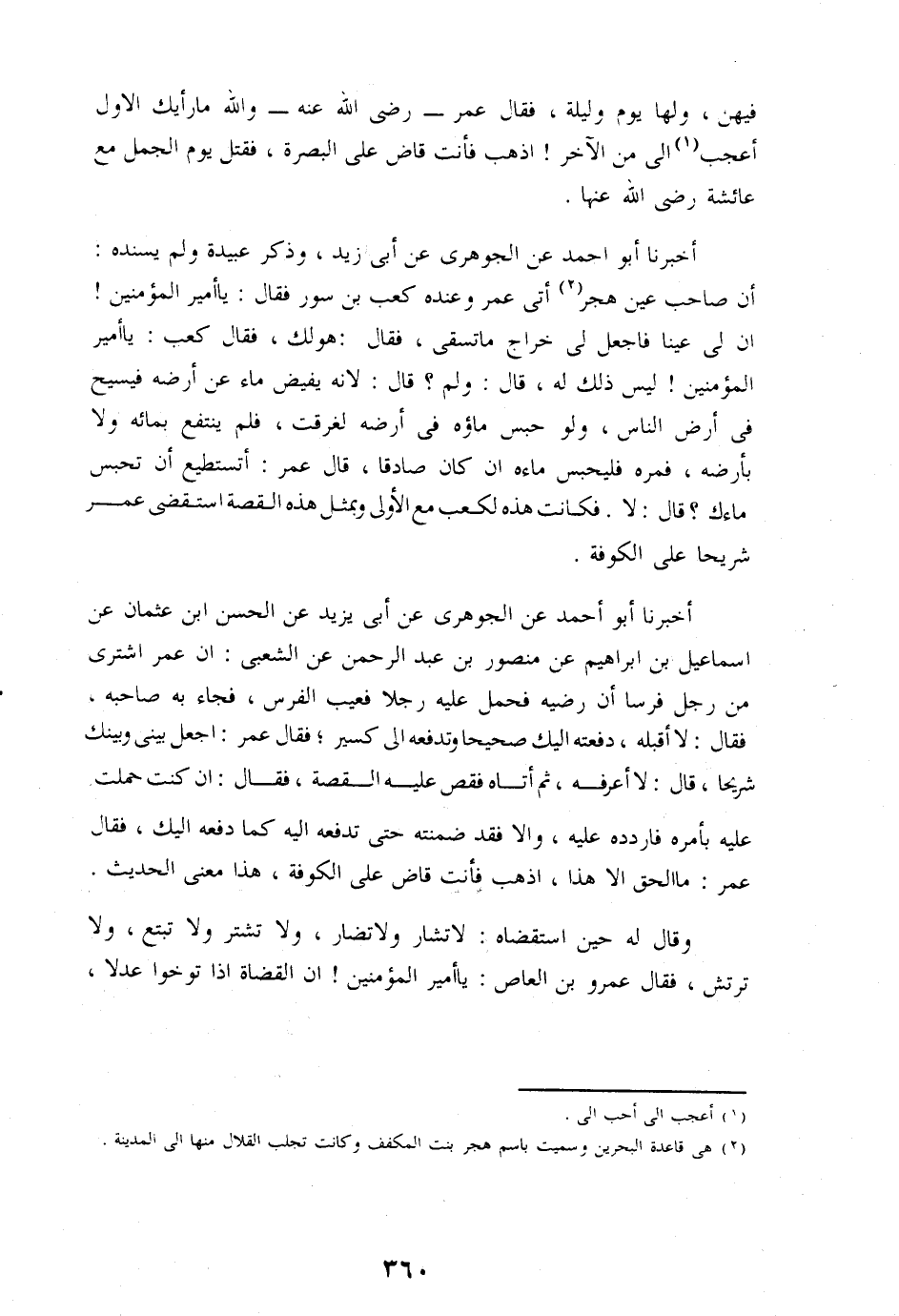 أن صاحب عين هجر «2» أتى عمر وعنده كعب بن سور فقال: يا أمير المؤمنين! ان لى عينا فاجعل لى خراج ما تسقى، فقال: هو لك، فقال كعب: يا أمير المؤمنين! ليس ذلك له، قال: ولم؟ قال: لانه يفيض ماء عن أرضه فيسيح فى أرض الناس، ولو حبس ماؤه فى أرضه لغرقت، فلم ينتفع بمائه ولا بأرضه، فمره فليحبس ماءه ان كان صادقا، قال عمر: أتستطيع أن تحبس ماءك؟ قال: لا. فكانت هذه لكعب مع الأولى وبمثل هذه القصة استقضى عمر شريحا على الكوفة.