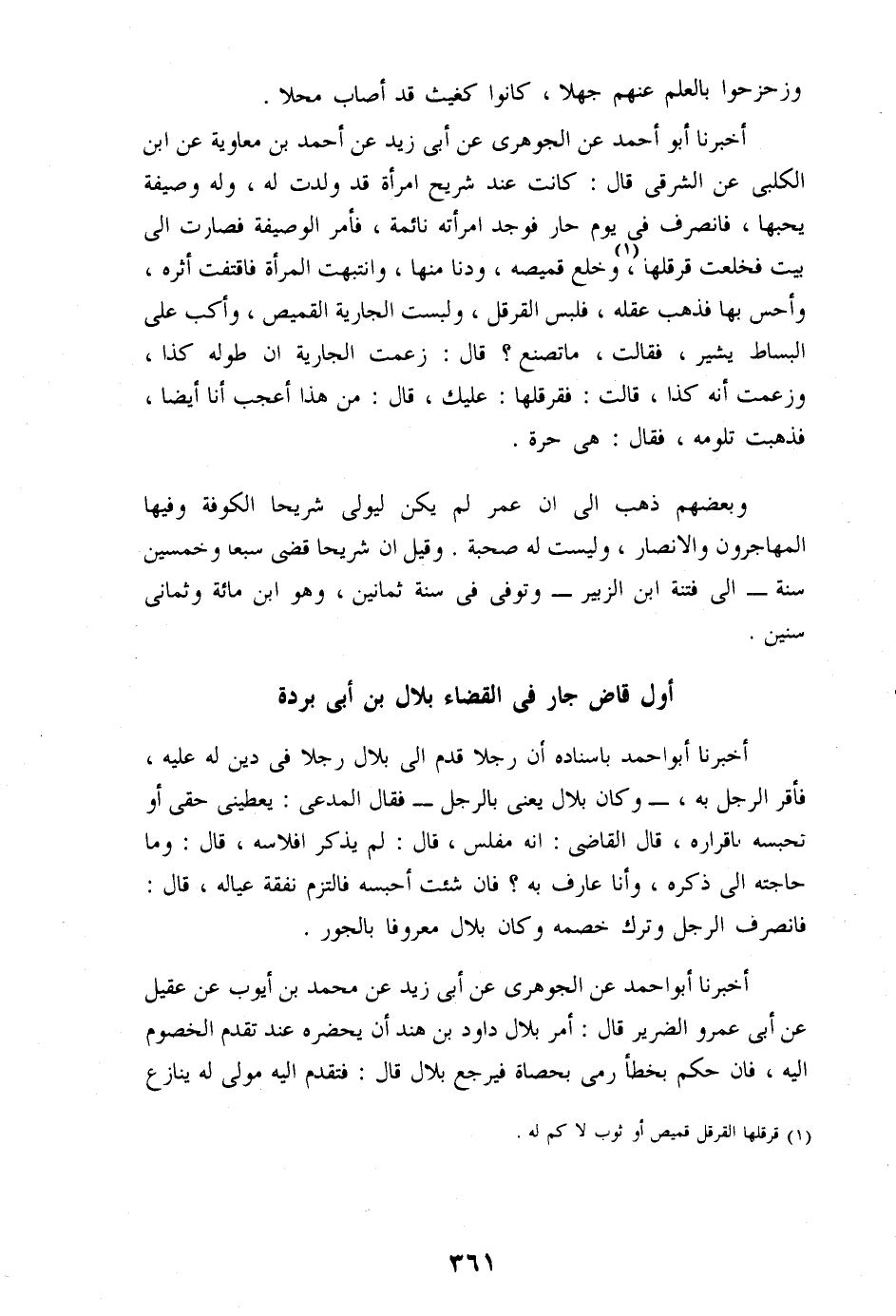 أخبرنا أبو أحمد عن الجوهرى عن أبى زيد عن أحمد بن معاوية عن ابن الكلبى عن الشرقى قال: كانت عند شريح امرأة قد ولدت له، وله وصيفة يحبها، فانصرف فى يوم حار فوجد امرأته نائمة، فأمر الوصيفة فصارت الى بيت فخلعت قرقلها، «1» وخلع قميصه، ودنا منها، وانتبهت المرأة فاقتفت أثره، وأحس بها فذهب عقله، فلبس القرقل، ولبست الجارية القميص، وأكب على البساط يشير، فقالت، ما تصنع؟ قال: زعمت الجارية ان طوله كذا، وزعمت أنه كذا، قالت: فقرقلها: عليك، قال: من هذا أعجب أنا أيضا، فذهبت تلومه، فقال: هى حرة.