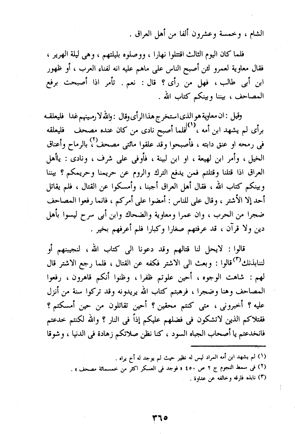 فلما كان اليوم الثالث اقتتلوا نهارا، ووصلوه بليلتهم، وهى ليلة الهرير، فقال معاوية لعمرو لئن أصبح الناس على ما هم عليه انه لفناء العرب، أو ظهور ابن أبى طالب، فهل من رأى؟ قال: نعم. تأمر اذا أصبحت برفع المصاحف، بيننا وبينكم كتاب الله.