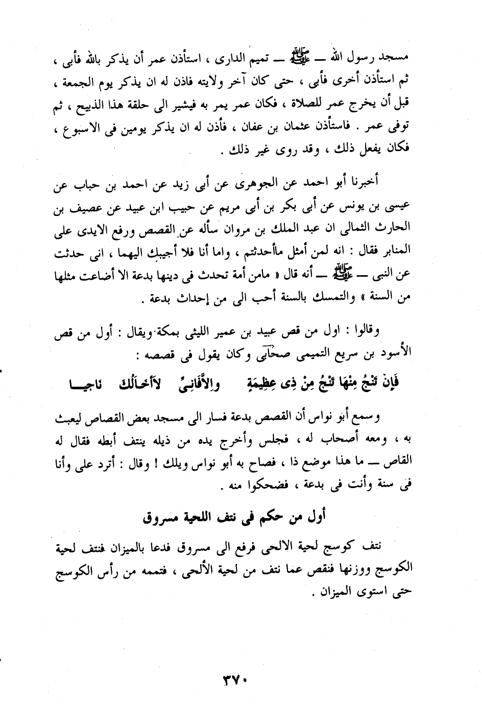 أخبرنا أبو أحمد عن الجوهرى عن أبى زيد عن احمد بن حباب عن عيسى بن يونس عن أبى بكر بن أبى مريم عن حبيب ابن عبيد عن عصيف بن الحارث الثمالى ان عبد الملك بن مروان سأله عن القصص ورفع الايدى على المنابر فقال: انه لمن أمثل ما أحدثتم، واما أنا فلا أجيبك اليهما، انى حدثت عن النبى- صلّى الله عليه وسلم- أنه قال «ما من أمة تحدث فى دينها بدعة الا أضاعت مثلها من السنة» والتمسك بالسنة أحب الى من إحداث بدعة.