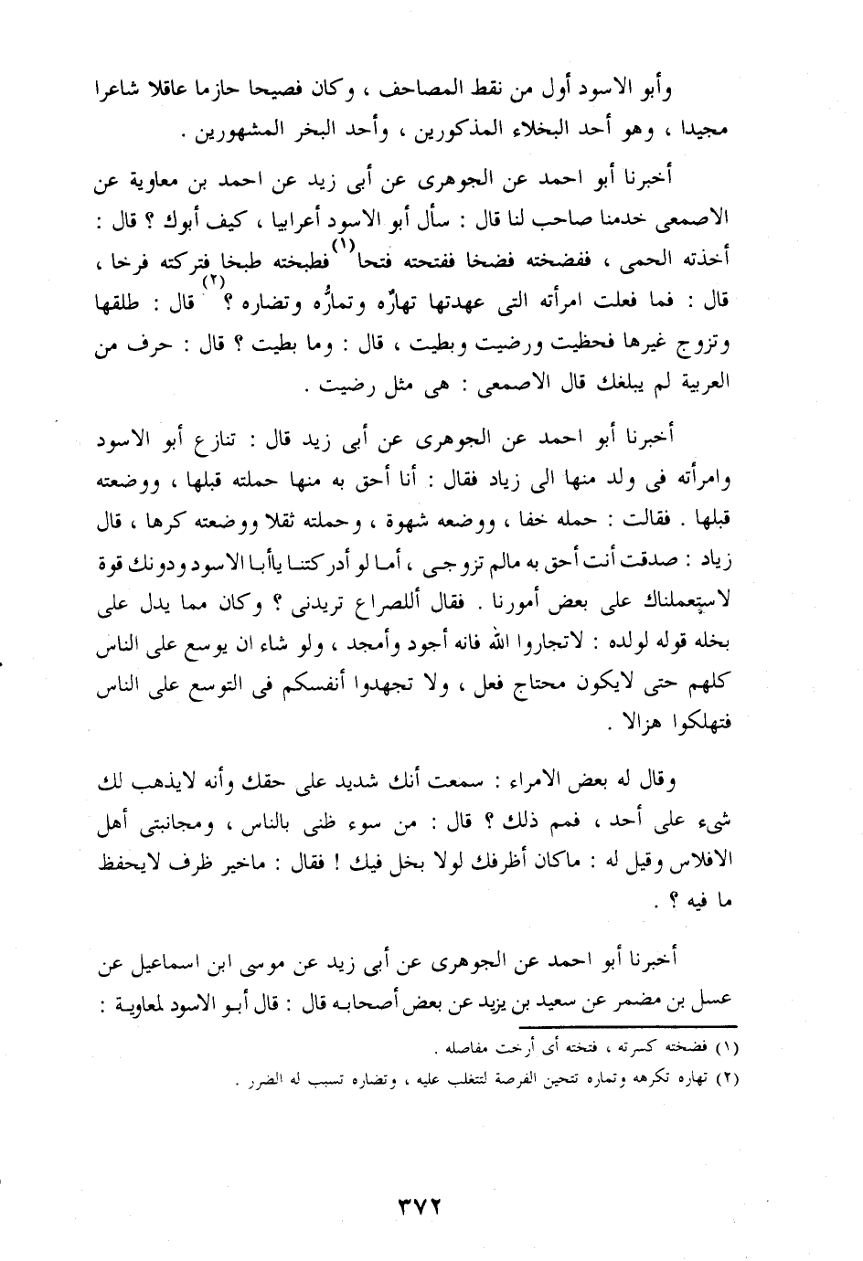 أخبرنا أبو احمد عن الجوهرى عن أبى زيد عن احمد بن معاوية عن الاصمعى خدمنا صاحب لنا قال: سأل أبو الاسود أعرابيا، كيف أبوك؟ قال:
