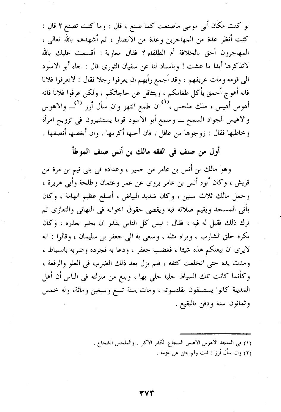 وهو مالك بن أنس بن عامر من حمير، وعداده فى بنى تيم بن مرة من قريش، وكان أبوه أنس بن عامر يروى عن عمر وعثمان وطلحة وأبى هريرة، وحمل مالك ثلاث سنين، وكان شديد البياض، أصلع عظيم الهامة، وكان يأتى المسجد ويقيم صلاته فيه ويقضى حقوق اخوانه فى التهانى والتعازى ثم ترك ذلك فقيل له فيه، فقال: ليس كل الناس يقدر ان يخبر بعذره، وكان يكره حلق الشارب، ويراه مثله، وسعى به الى جعفر بن سليمان، وقالوا: انه لا يرى ان بيعتكم هذه شيئا، فغضب جعفر، ودعا به فجرده وضربه بالسياط، ومدت يده حتى انخلعت كتفه، فلم يزل بعد ذلك الضرب فى العلو والرفعة، وكأنما كانت تلك السياط حليا حلى بها، وبلغ من منزلته فى الناس أن أهل المدينة كانوا يستسقون بقلنسوته، ومات سنة تسع وسبعين ومائة، وله خمس وثمانون سنة ودفن بالبقيع.