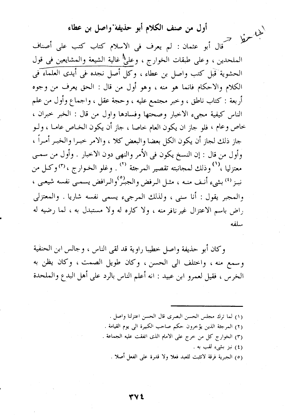 أول من صنف الكلام أبو حذيفة واصل بن عطاء