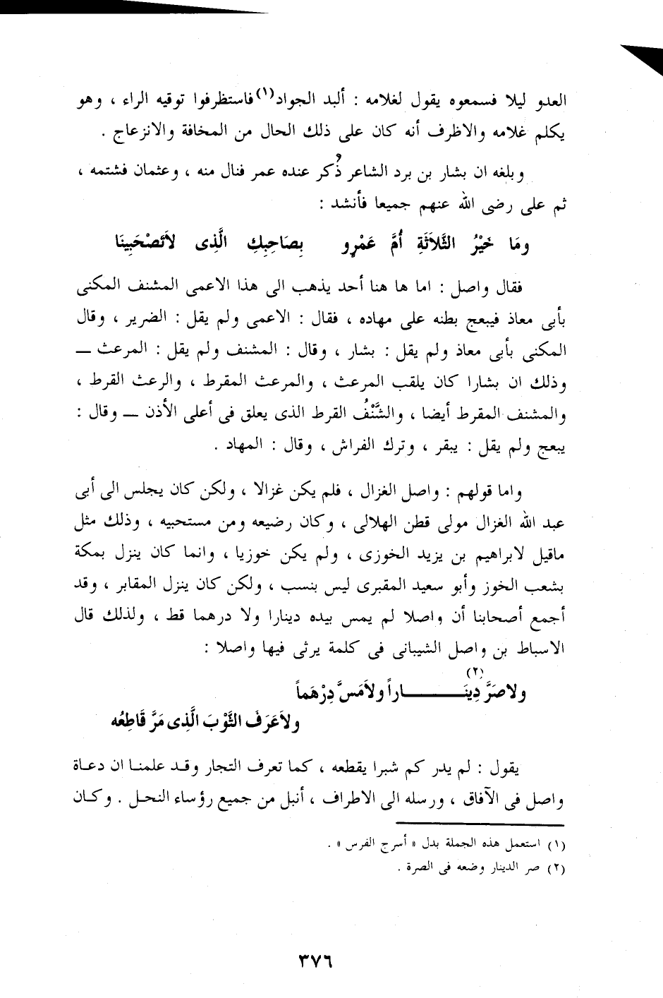 فقال واصل: اما هاهنا أحد يذهب الى هذا الاعمى المشنف المكنى بأبى معاذ فيبعج بطنه على مهاده، فقال: الاعمى ولم يقل: الضرير، وقال المكنى بأبى معاذ ولم يقل: بشار، وقال: المشنف ولم يقل: المرعث- وذلك ان بشارا كان يلقب المرعث، والمرعث المقرط، والرعث القرط، والمشنف المقرط أيضا، والشّنف القرط الذى يعلق فى أعلى الأذن- وقال: