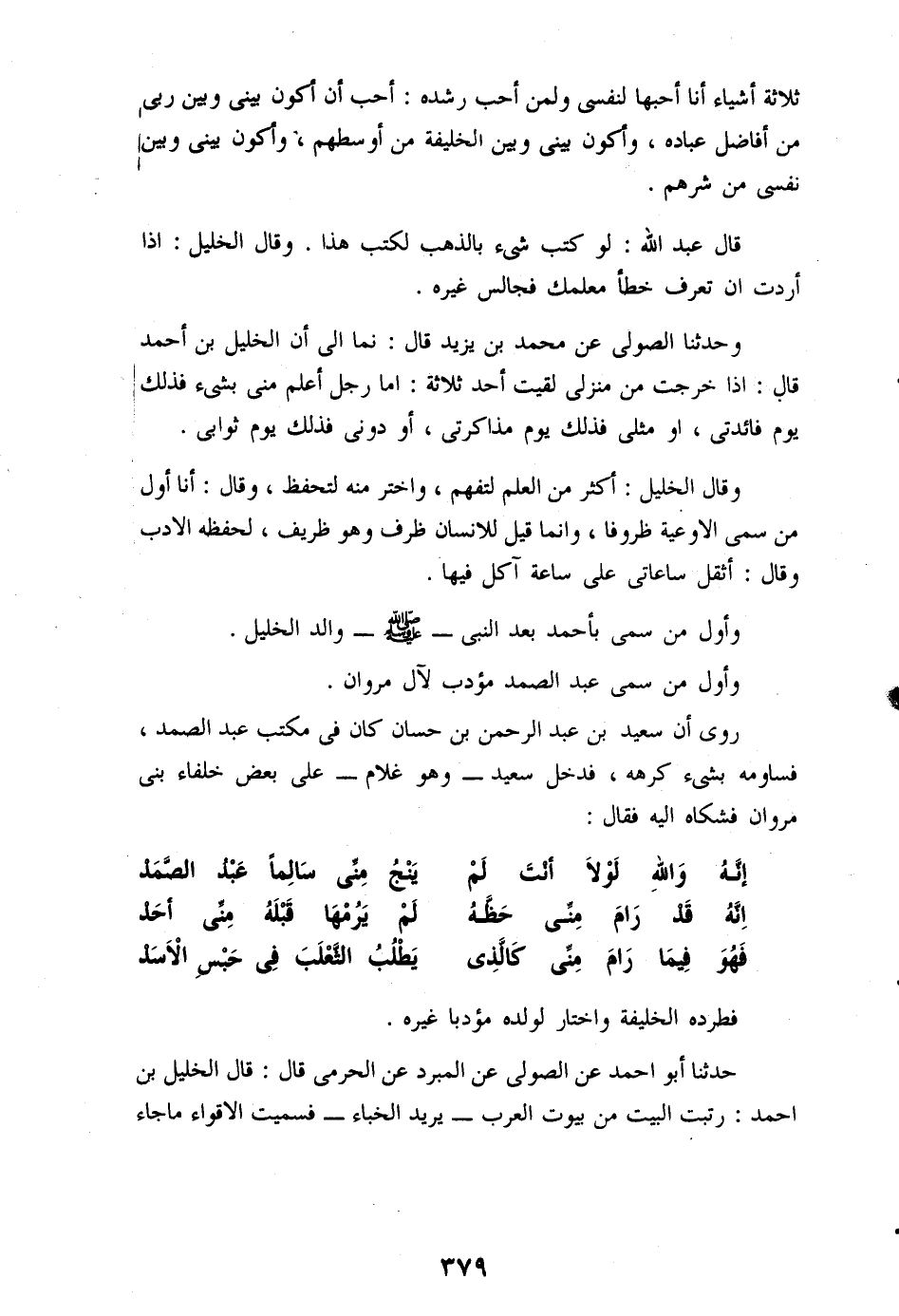 وحدثنا الصولى عن محمد بن يزيد قال: نما الى أن الخليل بن أحمد قال: اذا خرجت من منزلى لقيت أحد ثلاثة: اما رجل أعلم منى بشىء فذلك يوم فائدتى، او مثلى فذلك يوم مذاكرتى، أو دونى فذلك يوم ثوابى.