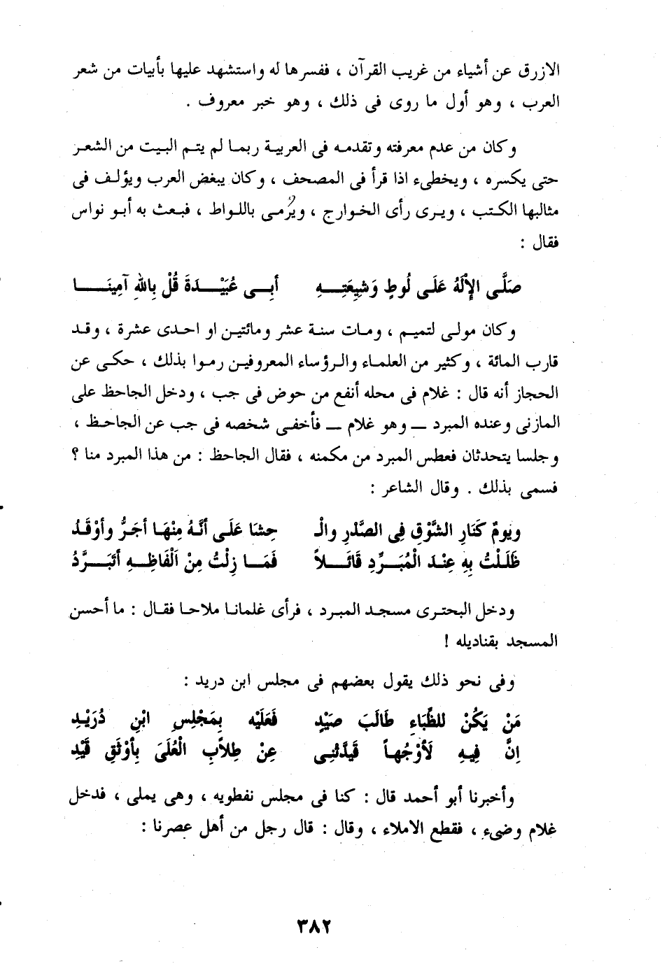 ودخل البحترى مسجد المبرد، فرأى غلمانا ملاحا فقال: ما أحسن المسجد بقناديله! وفى نحو ذلك يقول بعضهم فى مجلس ابن دريد: