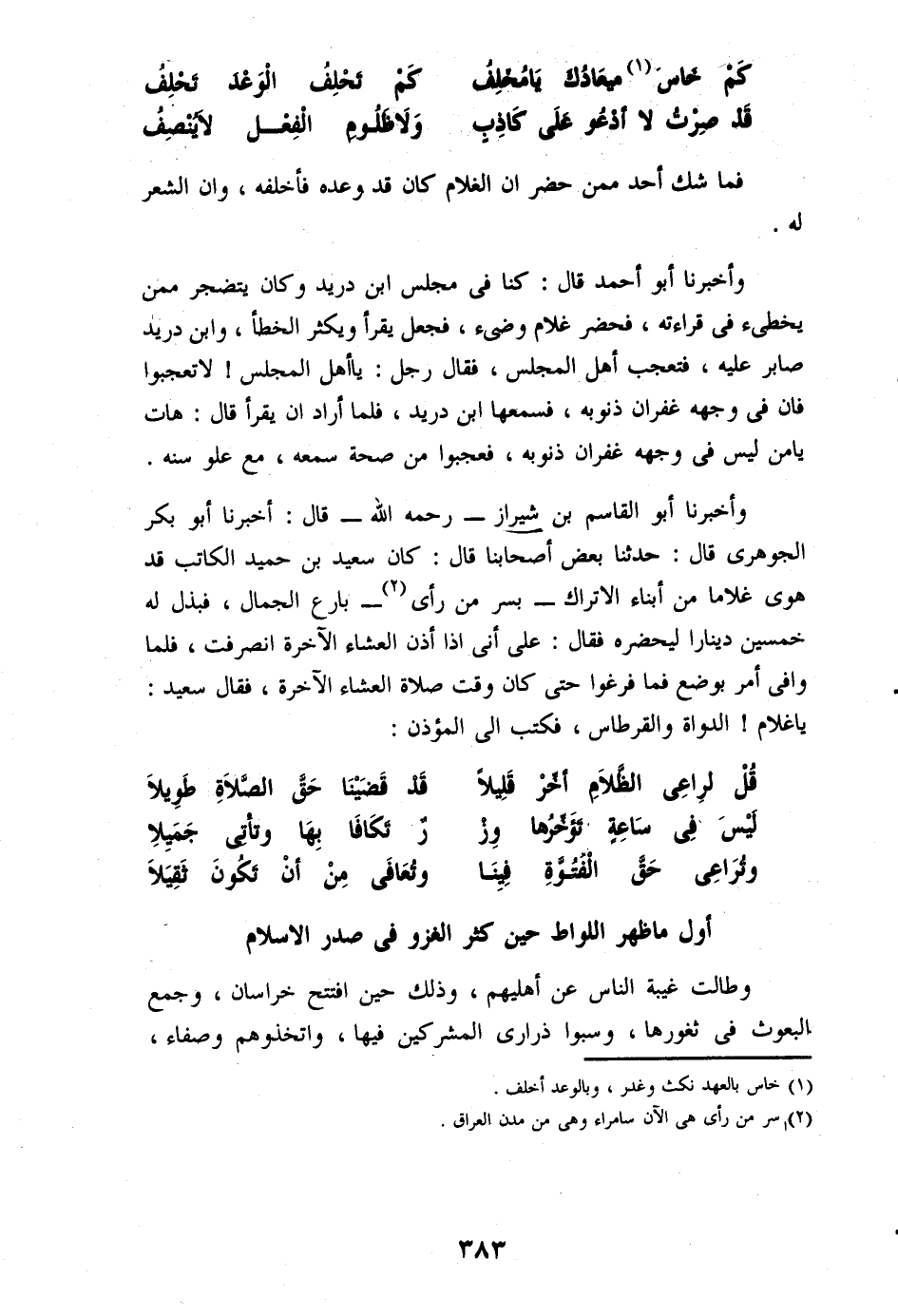 وأخبرنا أبو القاسم بن شيراز- رحمه الله- قال: أخبرنا أبو بكر الجوهرى قال: حدثنا بعض أصحابنا قال: كان سعيد بن حميد الكاتب قد هوى غلاما من أبناء الاتراك- بسر من رأى «2» - بارع الجمال، فبذل له خمسين دينارا ليحضره فقال: على أنى اذا أذن العشاء الآخرة انصرفت، فلما وافى أمر بوضع فما فرغوا حتى كان وقت صلاة العشاء الآخرة، فقال سعيد: