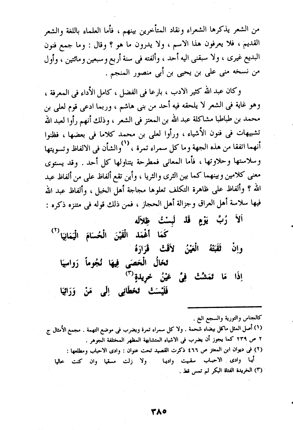من الشعر يذكرها الشعراء ونقاد المتأخرين بينهم، فأما العلماء باللغة والشعر القديم، فلا يعرفون هذا الاسم، ولا يدرون ما هو؟ وقال: وما جمع فنون البديع غيرى، ولا سبقنى اليه أحد، وألفته فى سنة أربع وسبعين ومائتين، وأول من نسخه منى على بن يحيى بن أبى منصور المنجم.