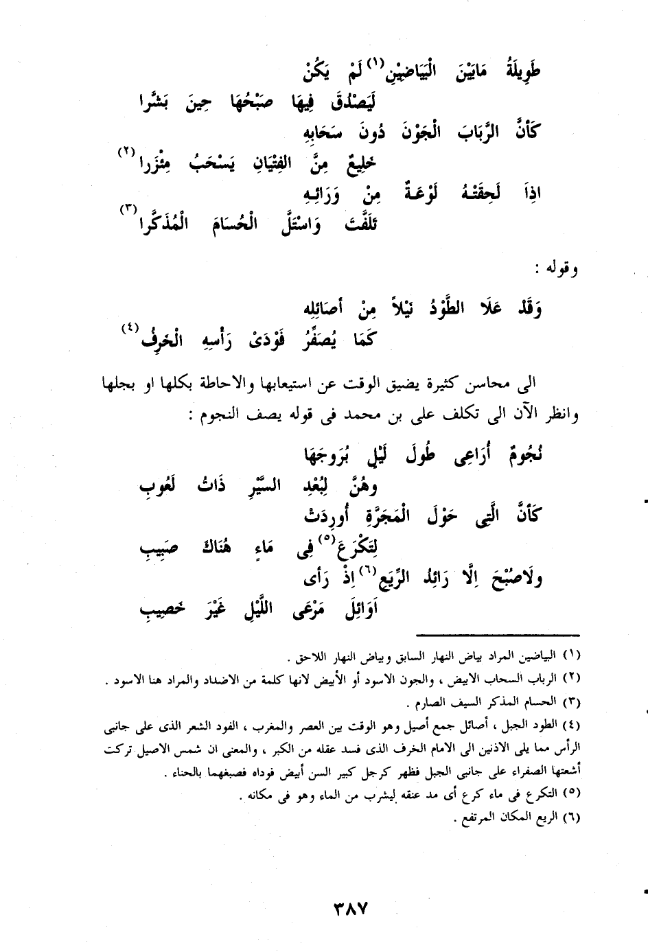 الى محاسن كثيرة يضيق الوقت عن استيعابها والاحاطة بكلها او بجلها وانظر الآن الى تكلف على بن محمد فى قوله يصف النجوم:
