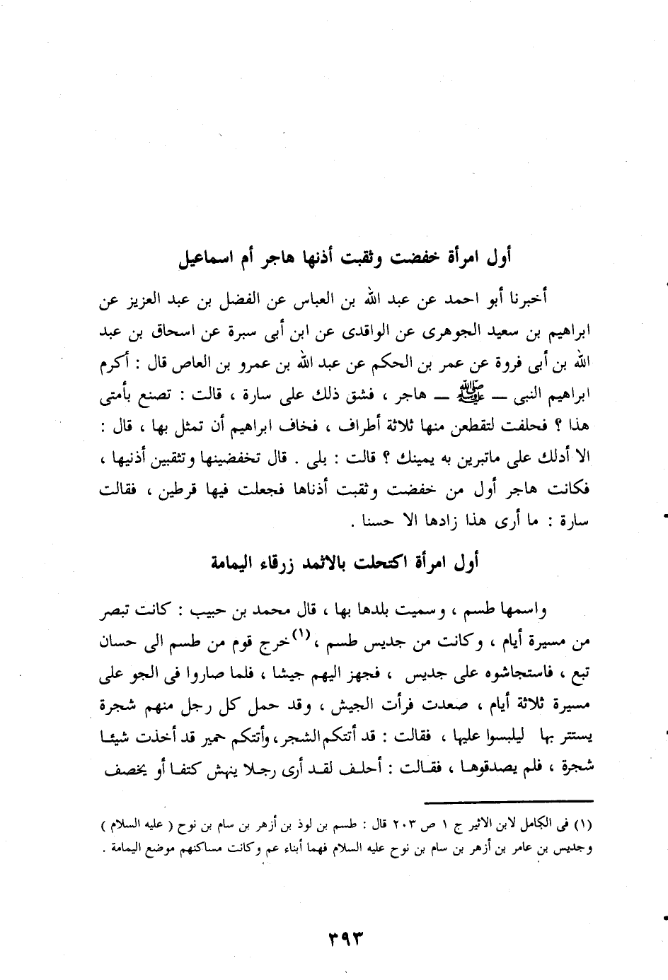الا أدلك على ما تبرين به يمينك؟ قالت: بلى. قال تخفضينها وتثقبين أذنيها، فكانت هاجر أول من خفضت وثقبت أذناها فجعلت فيها قرطين، فقالت سارة: ما أرى هذا زادها الا حسنا.