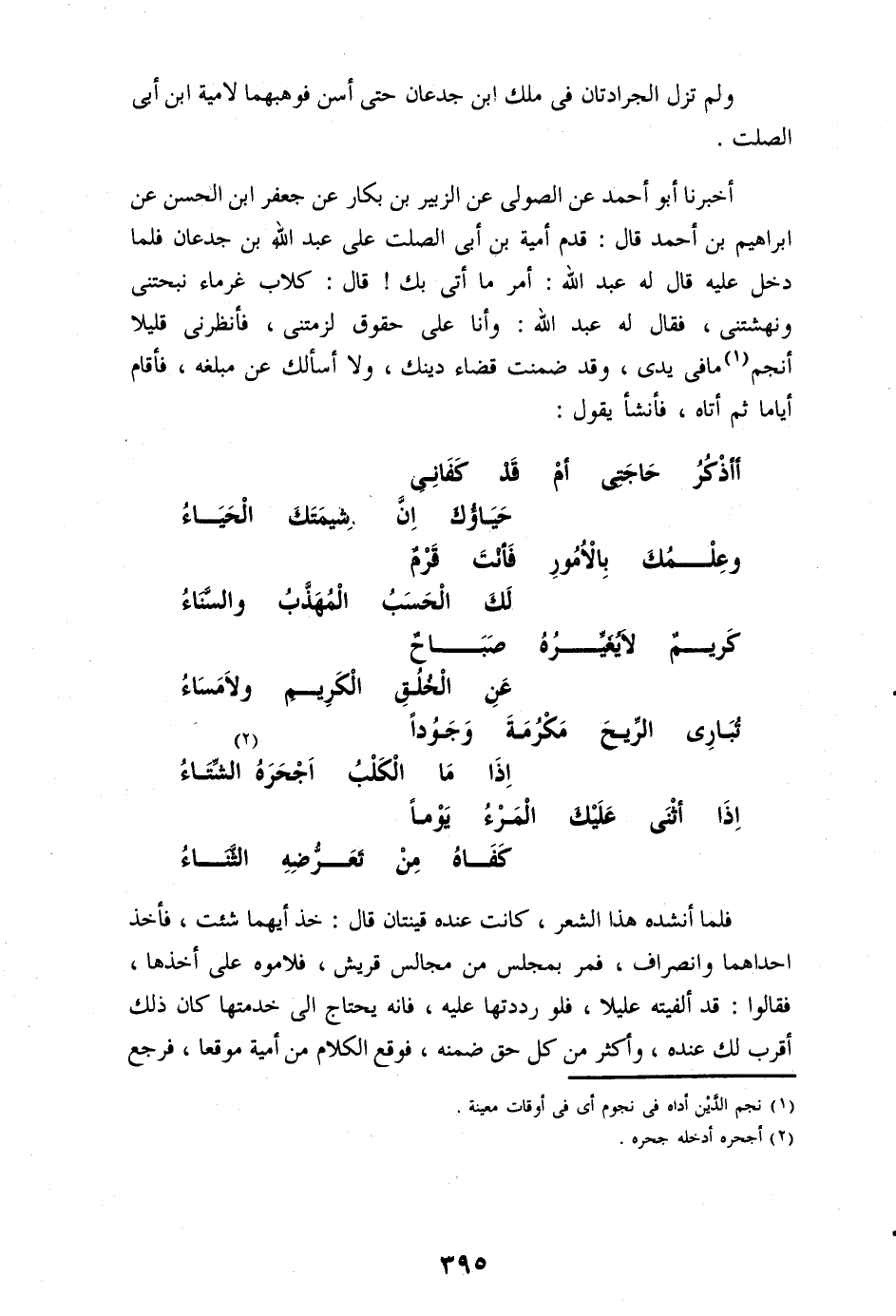 أخبرنا أبو أحمد عن الصولى عن الزبير بن بكار عن جعفر ابن الحسن عن ابراهيم بن أحمد قال: قدم أمية بن أبى الصلت على عبد الله بن جدعان فلما دخل عليه قال له عبد الله: أمر ما أتى بك! قال: كلاب غرماء نبحتنى ونهشتنى، فقال له عبد الله: وأنا على حقوق لزمتنى، فأنظرنى قليلا أنجم «1» ما فى يدى، وقد ضمنت قضاء دينك، ولا أسألك عن مبلغه، فأقام أياما ثم أتاه، فأنشأ يقول: