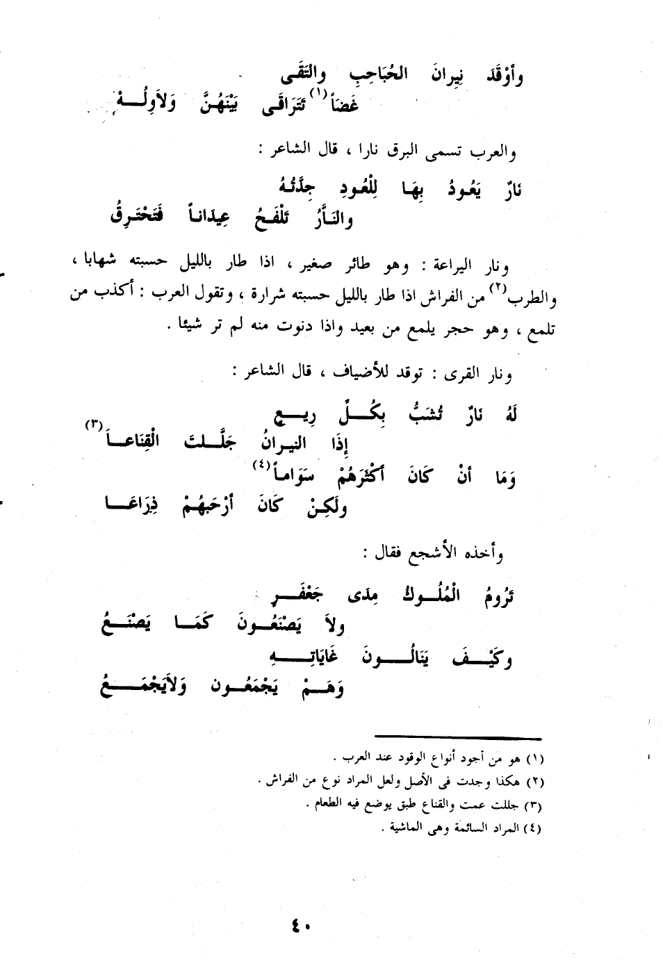ونار اليراعة: وهو طار صغير، اذا طار بالليل حسبته شهابا، والطرب «2» من الفراش اذا طار بالليل حسبته شرارة، وتقول العرب: أكذب من تلمع، وهو حجر يلمع من بعيد واذا دنوت منه لم تر شيئا.