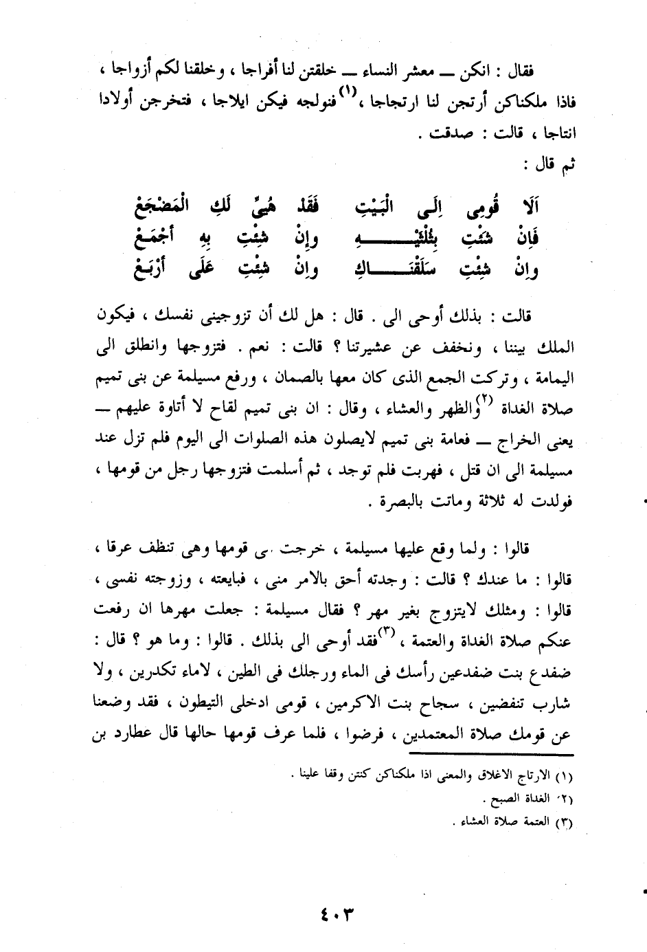 قالوا: ولما وقع عليها مسيلمة، خرجت هى قومها وهى تنظف عرقا، قالوا: ما عندك؟ قالت: وجدته أحق بالامر منى، فبايعته، وزوجته نفسى، قالوا: ومثلك لا يتزوج بغير مهر؟ فقال مسيلمة: جعلت مهرها ان رفعت عنكم صلاة الغداة والعتمة، «3» فقد أوحى الى بذلك. قالوا: وما هو؟ قال: