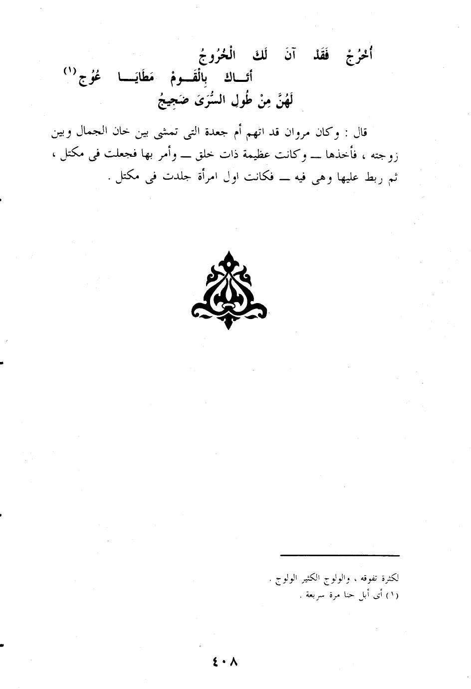 لهنّ من طول السّرى ضجيج قال: وكان مروان قد اتهم أم جعدة التى تمشى بين خان الجمال وبين زوجته، فأخذها- وكانت عظيمة ذات خلق- وأمر بها فجعلت فى مكتل، ثم ربط عليها وهى فيه- فكانت اول امرأة جلدت فى مكتل.