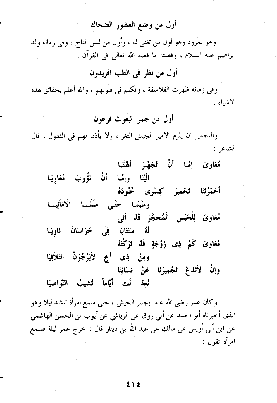 وكان عمر رضى الله عنه يجمر الجيش، حتى سمع امرأة تنشد ليلا وهو الذى أخبرناه أبو احمد عن أبى روق عن الرياشى عن أيوب بن الحسن الهاشمى عن ابن أبى أويس عن مالك عن عبد الله بن دينار قال: خرج عمر ليلة فسمع امرأة تقول: