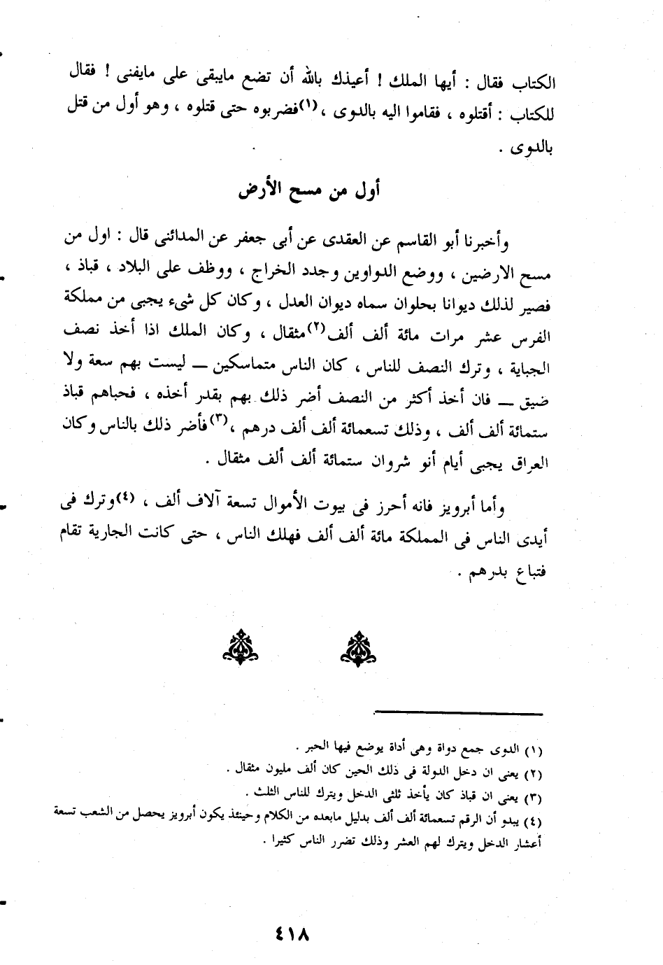 وأخبرنا أبو القاسم عن العقدى عن أبى جعفر عن المدائنى قال: اول من مسح الارضين، ووضع الدواوين وجدد الخراج، ووظف على البلاد، قباذ، فصير لذلك ديوانا بحلوان سماه ديوان العدل، وكان كل شىء يجبى من مملكة الفرس عشر مرات مائة ألف ألف «2» مثقال، وكان الملك اذا أخذ نصف الجباية، وترك النصف للناس، كان الناس متماسكين- ليست بهم سعة ولا ضيق- فان أخذ أكثر من النصف أضر ذلك بهم بقدر أخذه، فحباهم قباذ ستمائة ألف ألف، وذلك تسعمائة ألف ألف درهم، «3» فأضر ذلك بالناس وكان العراق يجبى أيام أنو شروان ستمائة ألف ألف مثقال.
