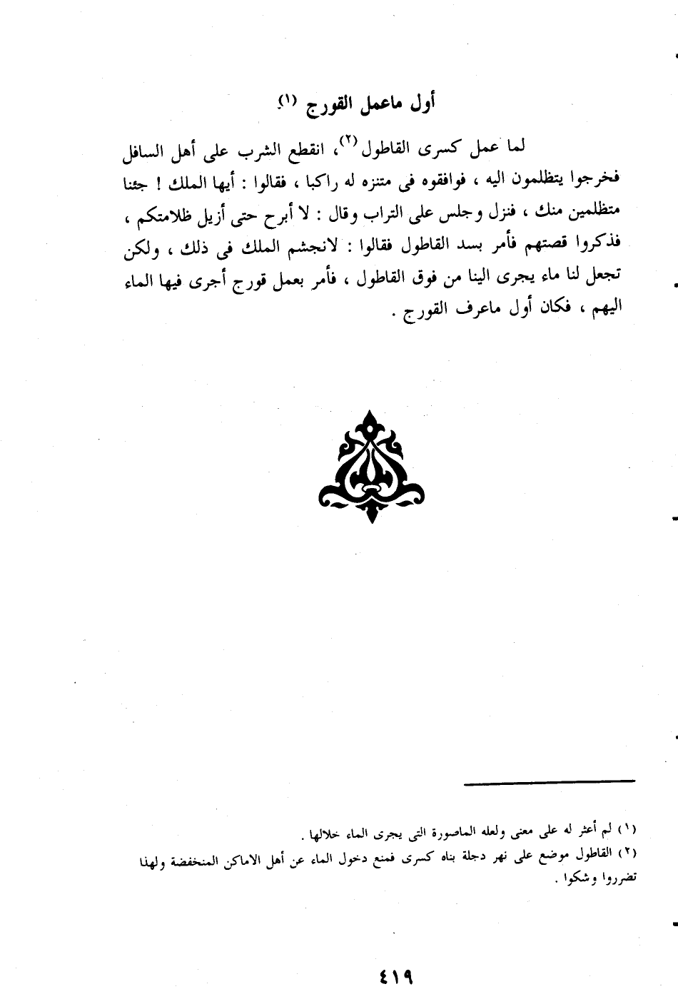 لما عمل كسرى القاطول «2» ، انقطع الشرب على أهل السافل فخرجوا يتظلمون اليه، فوافقوه فى متنزه له راكبا، فقالوا: أيها الملك! جئنا متظلمين منك، فنزل وجلس على التراب وقال: لا أبرح حتى أزيل ظلامتكم، فذكروا قصتهم فأمر بسد القاطول فقالوا: لا نجشم الملك فى ذلك، ولكن تجعل لنا ماء يجرى الينا من فوق القاطول، فأمر بعمل قورج أجرى فيها الماء اليهم، فكان أول ما عرف القورج.