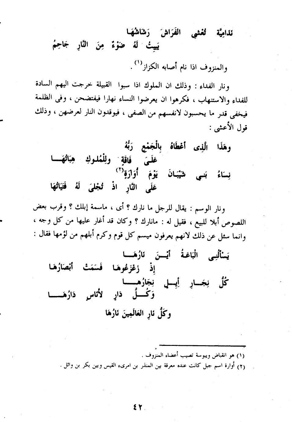 ونار الفداء: وذلك ان الملوك اذا سبوا القبيلة خرجت اليهم السادة للفداء والاستنهاب، فكرهوا ان يعرضوا النساء نهارا فيفتضحن، وفى الظلمة فيخفى قدر ما يحسبون لانفسهم من الصفى، فيوقدون النار لعرضهن، وذلك قول الأعشى: