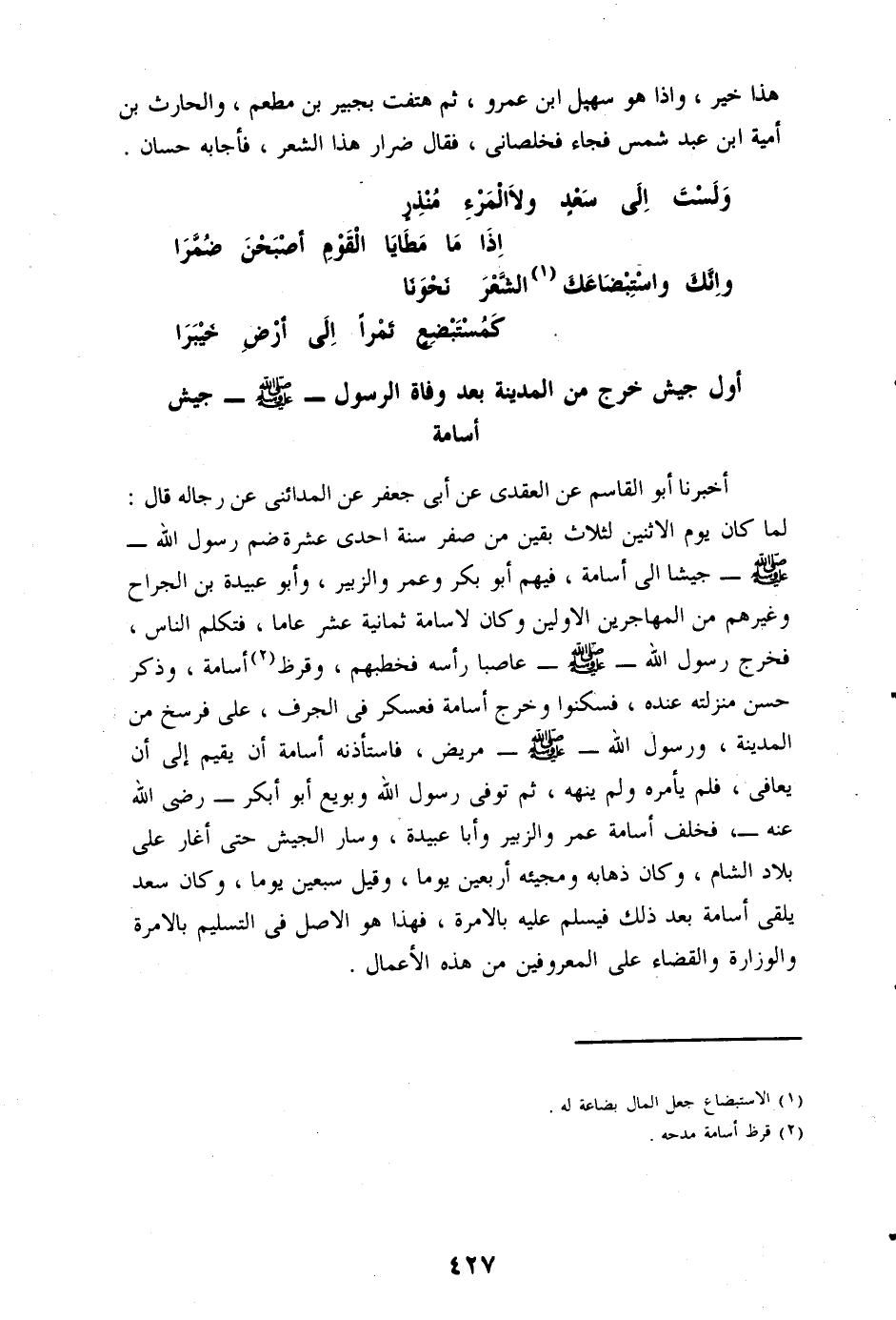 لما كان يوم الاثنين لثلاث بقين من صفر سنة احدى عشرة ضم رسول الله- صلّى الله عليه وسلم- جيشا الى أسامة، فيهم أبو بكر وعمر والزبير، وأبو عبيدة بن الجراح وغيرهم من المهاجرين الاولين وكان لاسامة ثمانية عشر عاما، فتكلم الناس، فخرج رسول الله- صلّى الله عليه وسلم- عاصبا رأسه فخطبهم، وقرظ «2» أسامة، وذكر حسن منزلته عنده، فسكنوا وخرج أسامة فعسكر فى الجرف، على فرسخ من المدينة، ورسول الله- صلّى الله عليه وسلم- مريض، فاستأذنه أسامة أن يقيم إلى أن يعافى، فلم يأمره ولم ينهه، ثم توفى رسول الله وبويع أبو أبكر- رضى الله عنه-، فخلف أسامة عمر والزبير وأبا عبيدة، وسار الجيش حتى أغار على بلاد الشام، وكان ذهابه ومجيئه أربعين يوما، وقيل سبعين يوما، وكان سعد يلقى أسامة بعد ذلك فيسلم عليه بالامرة، فهذا هو الاصل فى التسليم بالامرة والوزارة والقضاء على المعروفين من هذه الأعمال.