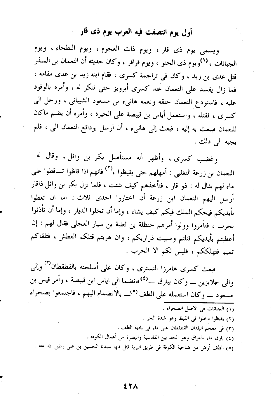 ويسمى يوم ذى قار، ويوم ذات العجوم، ويوم البطحاء، ويوم الجبانات، «1» ويوم ذى الحنو، ويوم قراقر، وكان حديثه أن النعمان بن المنذر قتل عدى بن زيد، وكان فى تراجمة كسرى، فقام ابنه زيد بن عدى مقامه، فما زال يفسد على النعمان عند كسرى أبرويز حتى تنكر له، وأمره بالوفود عليه، فاستودع النعمان حلقه ونعمه هانىء بن مسعود الشيبانى، ورحل الى كسرى، فقتله، واستعمل أياس بن قبيصة على الحيرة، وأمره أن يضم ما كان للنعمان فيبعث به إليه، فبعث إلى هانىء، أن أرسل بودائع النعمان الى، فلم يجبه الى ذلك.