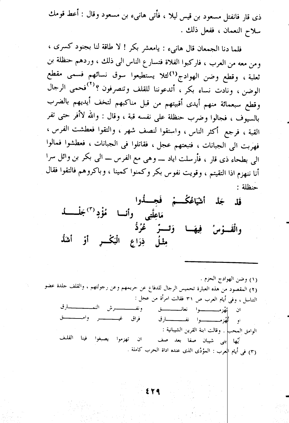 فلما دنا الجمعان قال هانىء: يا معشر بكر! لا طاقة لنا بجنود كسرى، ومن معه من العرب، فاركبوا الفلاة فتسارع الناس الى ذلك، وردهم حنظلة بن ثعلبة، وقطع وضن الهوادج «1» لئلا يستطيعوا سوق نسائهم فسمى مقطع الوضن، ونادت نساء بكر، أتدعوننا للقلف وتنصرفون؟ «2» فحمى الرجال وقطع سبعمائة منهم أيدى أقبيتهم من قبل مناكبهم لتخف أيديهم بالضرب بالسيوف، فجالوا وضرب حنظلة على نفسه قبة، وقال: والله لا أفر حتى تفر القبة، فرجع أكثر الناس، واستقوا لنصف شهر، والتقوا فعطشت الفرس، فهربت الى الجبانات، فتبعتهم عجل، فقاتلوا فى الجبانات، فعطشوا فمالوا الى بطحاء ذى قار، فأرسلت اياد- وهى مع الفرس- الى بكر بن وائل سرا أنا ننهزم اذا التقيتم، وقويت نفوس بكر وكمنوا كمينا، وباكروهم فالتقوا فقال حنظلة: