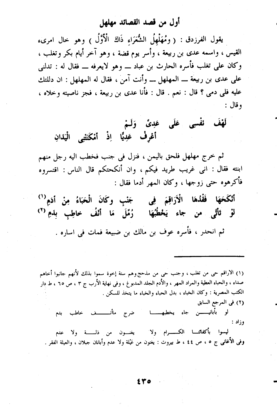 يقول الفرزدق: (ومهلهل الشّعراء ذاك الأوّل) وهو خال امرىء القيس، واسمه عدى بن ربيعة، وأسر يوم قضة، وهو آخر أيام بكر وتغلب، وكان على تغلب فأسره الحارث بن عباد- وهو لا يعرفه- فقال له: تدلنى على عدى بن ربيعة- المهلهل- وأنت آمن، فقال له المهلهل: ان دللتك عليه فلى دمى؟ قال: نعم. قال: فأنا عدى بن ربيعة، فجز ناصيته وخلاه، وقال:
