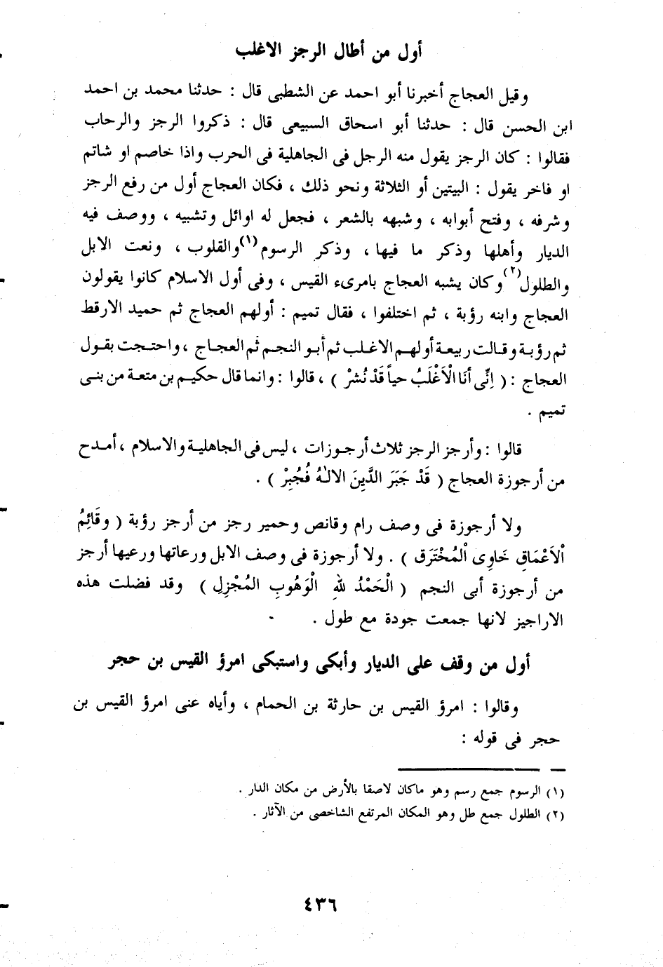 ولا أرجوزة فى وصف رام وقانص وحمير رجز من أرجز رؤبة (وقائم الاعماق خاوى المخترق) . ولا أرجوزة فى وصف الابل ورعاتها ورعيها أرجز من أرجوزة أبى النجم (الحمد لله الوهوب المجزل) وقد فضلت هذه الاراجيز لانها جمعت جودة مع طول.