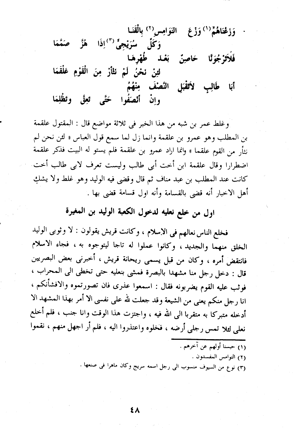 وغلط عمر بن شبه من هذا الخبر فى ثلاثة مواضع قال: المقتول علقمة بن المطلب وهو عمرو بن علقمة وانما زل لما سمع قول العباس «لئن نحن لم نثأر من القوم علقما» وانما اراد عمرو بن علقمة فلم يستو له البيت فذكر علقمة اضطرارا وقال علقمة ابن أخت أبى طالب وليست تعرف لابى طالب أخت كانت عند المطلب بن عبد مناف ثم قال وقضى فيه الوليد وهو غلط ولا يشك أهل الاخبار أنه قضى بالقسامة وأنه اول قسامة قضى بها.