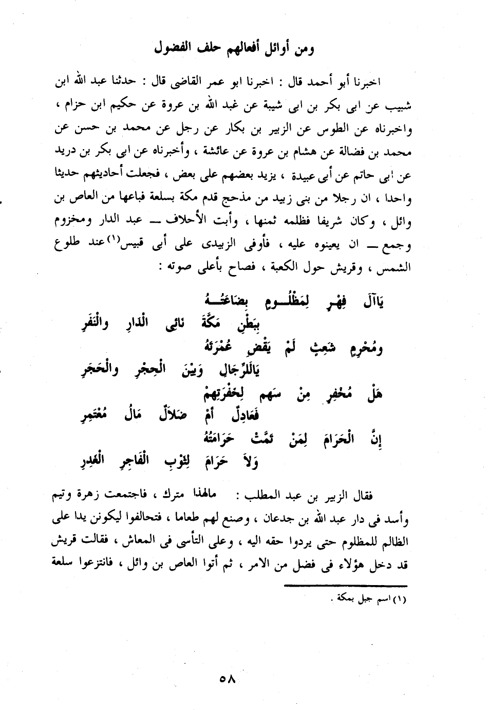 اخبرنا أبو أحمد قال: اخبرنا ابو عمر القاضى قال: حدثنا عبد الله ابن شبيب عن ابى بكر بن ابى شيبة عن عبد الله بن عروة عن حكيم ابن حزام، واخبرناه عن الطوس عن الزبير بن بكار عن رجل عن محمد بن حسن عن محمد بن فضالة عن هشام بن عروة عن عائشة، وأخبرناه عن ابى بكر بن دريد عن ابى حاتم عن أبى عبيدة، يزيد بعضهم على بعض، فجعلت أحاديثهم حديثا واحدا، ان رجلا من بنى زبيد من مذحج قدم مكة بسلعة فباعها من العاص بن وائل، وكان شريفا فظلمه ثمنها، وأبت الأحلاف- عبد الدار ومخزوم وجمع- ان يعينوه عليه، فأوفى الزبيدى على أبى قبيس «1» عند طلوع الشمس، وقريش حول الكعبة، فصاح بأعلى صوته: