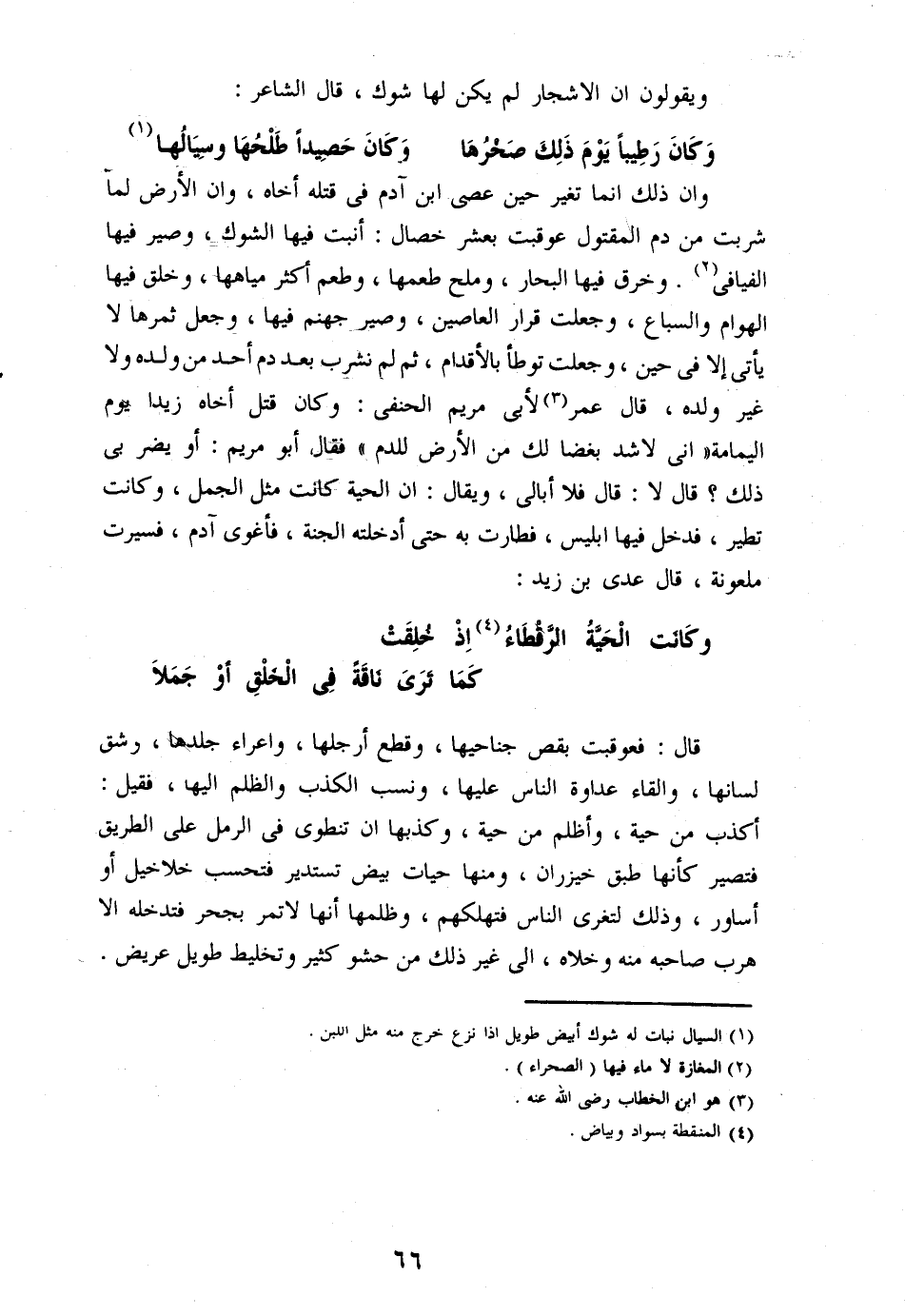 وان ذلك انما تغير حين عصى ابن آدم فى قتله أخاه، وان الأرض لما شربت من دم المقتول عوقبت بعشر خصال: أنبت فيها الشوك، وصير فيها الفيافى «2» . وخرق فيها البحار، وملح طعمها، وطعم أكثر مياهها، وخلق فيها الهوام والسباع، وجعلت قرار العاصين، وصير جهنم فيها، وجعل ثمرها لا يأتى إلا فى حين، وجعلت توطأ بالأقدام، ثم لم نشرب بعد دم أحد من ولده ولا غير ولده، قال عمر «3» لأبى مريم الحنفى: وكان قتل أخاه زيدا يوم اليمامة «انى لاشد بغضا لك من الأرض للدم» فقال أبو مريم: أو يضر بى ذلك؟ قال لا: قال فلا أبالى، ويقال: ان الحية كانت مثل الجمل، وكانت تطير، فدخل فيها ابليس، فطارت به حتى أدخلته الجنة، فأغوى آدم، فسيرت ملعونة، قال عدى بن زيد: