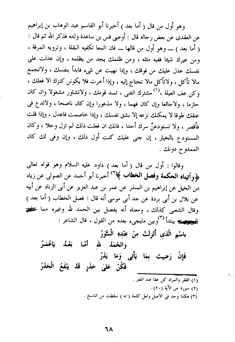 «2» أخبرنا أبو أحمد عن الصولى عن زياد ابن الخيل عن إبراهيم بن المنذر عن عمر بن عبد العزيز عن أبى الزناد عن أبيه عن بلال بن أبى بردة عن جد أبى موسى أنه قال: فصل الخطاب (أما بعد) وقال الشعبى كذلك، ومعناه أنه يفصل بين الحمد لله وغيره مما سابق البربرى: يبتدأ «3» وبين ما يجىء بعده من القول، قال الشاعر: