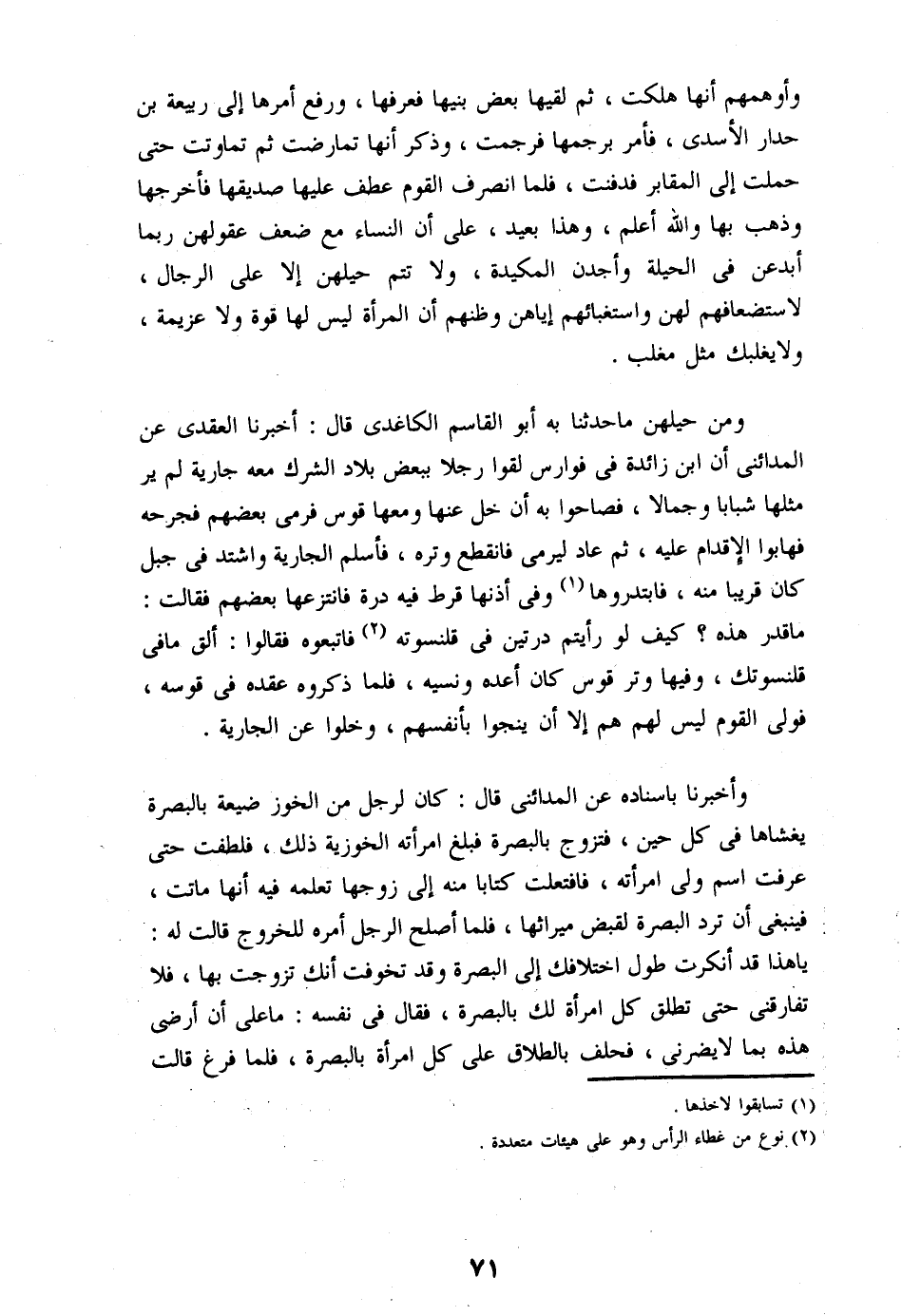 ومن حيلهن ما حدثنا به أبو القاسم الكاغدى قال: أخبرنا العقدى عن المدائنى أن ابن زائدة فى فوارس لقوا رجلا ببعض بلاد الشرك معه جارية لم ير مثلها شبابا وجمالا، فصاحوا به أن خل عنها ومعها قوس فرمى بعضهم فجرحه فهابوا الإقدام عليه، ثم عاد ليرمى فانقطع وتره، فأسلم الجارية واشتد فى جبل كان قريبا منه، فابتدروها»