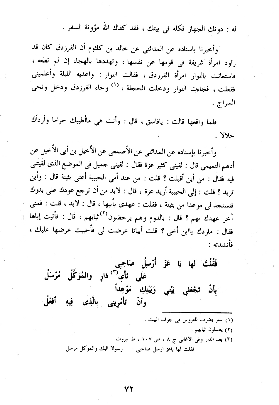 وأخبرنا باسناده عن المدائنى عن خالد بن كلثوم أن الفرزدق كان قد راود امرأة شريفة فى قومها عن نفسها، وتهددها بالهجاء إن لم تطعه، فاستعانت بالنوار امرأة الفرزدق، فقالت النوار: واعديه الليلة وأعلمينى ففعلت، فجاءت النوار ودخلت الحجلة، «1» وجاء الفرزدق ودخل ونحى السراج.