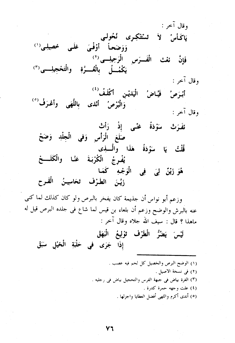 وزعم أبو نواس أن جذيمة كان يفخر بالبرص ولو كان كذلك لما كنى عنه بالبرش والوضح وزعم أن بلعاء بن قيس لما شاع فى جلده البرص قيل له ما هذا؟ قال: سيف الله جلاه وقال آخر: