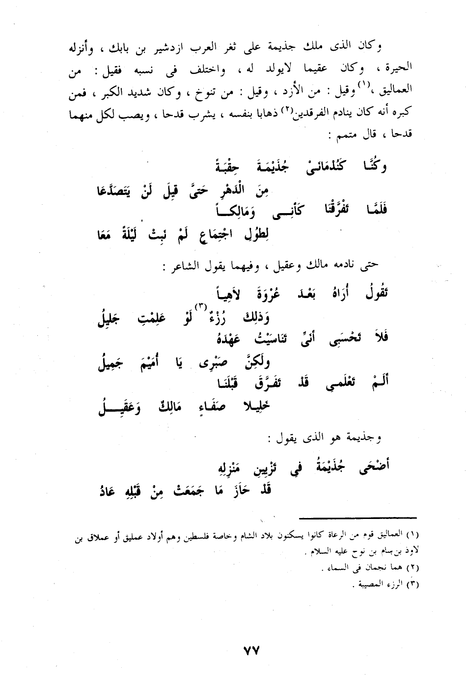 وكان الذى ملك جذيمة على ثغر العرب ازدشير بن بابك، وأنزله الحيرة، وكان عقيما لا يولد له، واختلف فى نسبه فقيل: من العماليق، «1» وقيل: من الأزد، وقيل: من تنوخ، وكان شديد الكبر، فمن كبره أنه كان ينادم الفرقدين «2» ذهابا بنفسه، يشرب قدحا، ويصب لكل منهما قدحا، قال متمم: