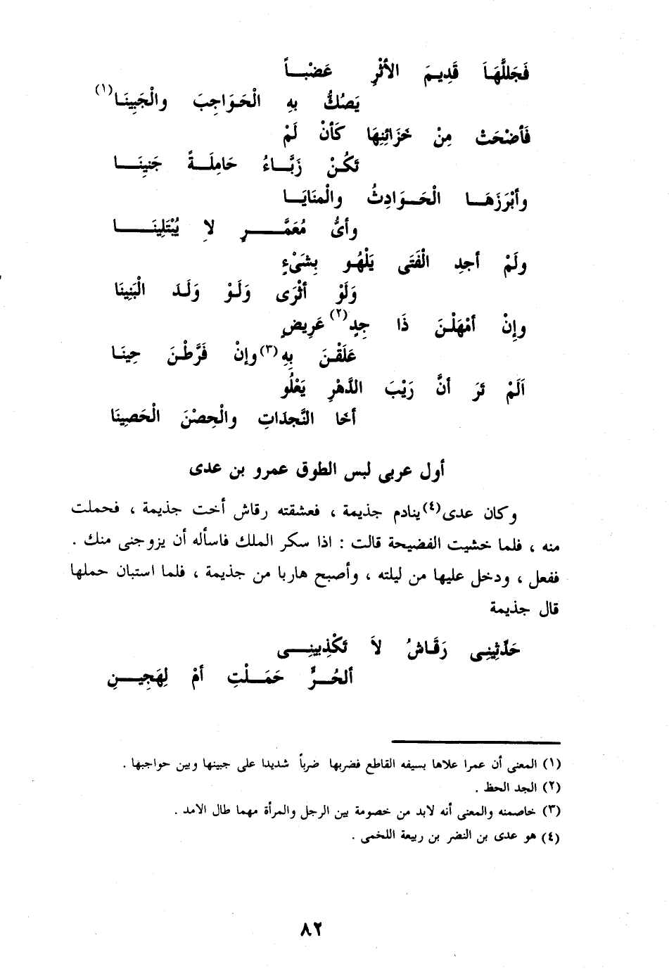 وكان عدى «4» ينادم جذيمة، فعشقته رقاش أخت جذيمة، فحملت منه، فلما خشيت الفضيحة قالت: اذا سكر الملك فاسأله أن يزوجنى منك.