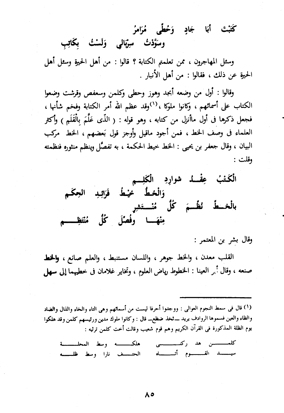وسئل المهاجرون، ممن تعلمتم الكتابة؟ قالوا: من أهل الحيرة وسئل أهل الحيرة عن ذلك، فقالوا: من أهل الأنبار.